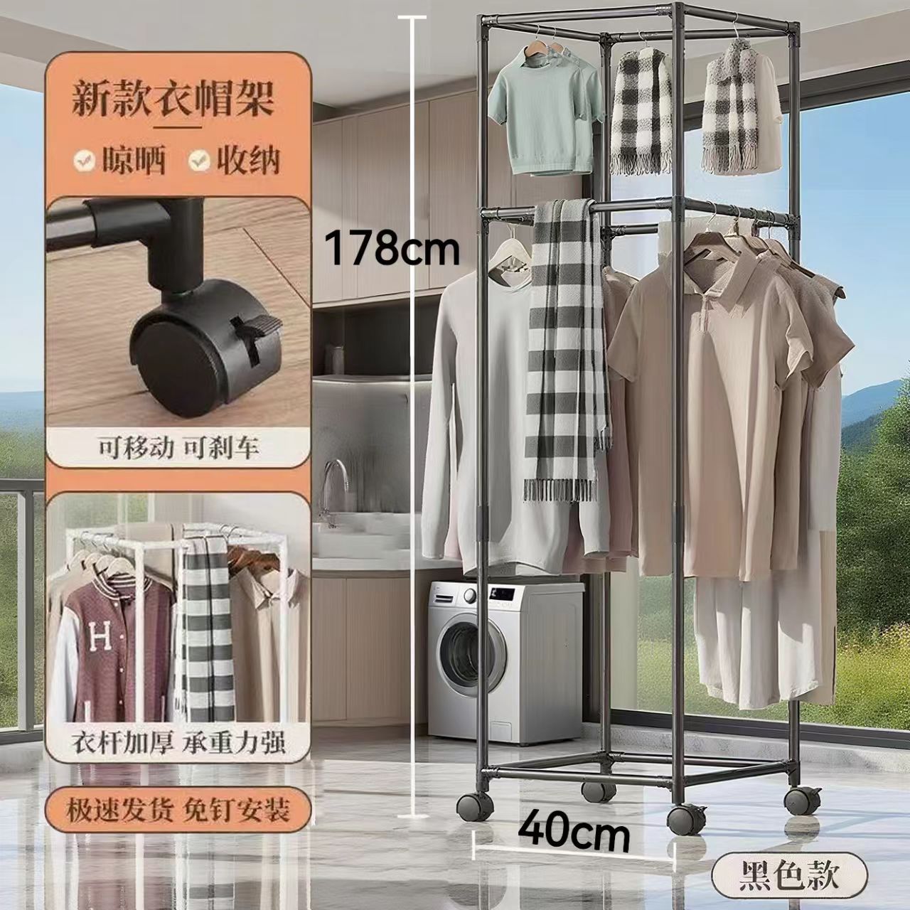 black-four-sided rotating clothes drying rack-single-layer hanger clothes + universal wheels