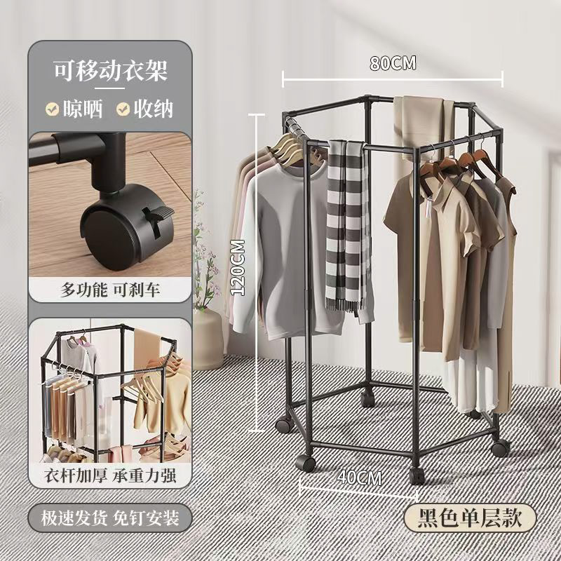 black-hexagonal rotating clothes drying rack-single-layer hanger clothes + universal wheels