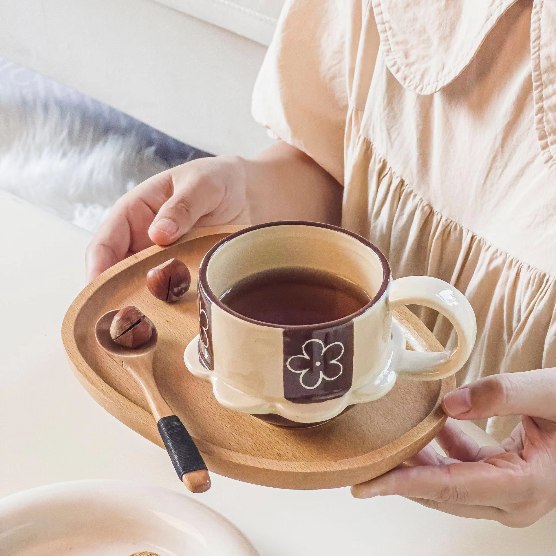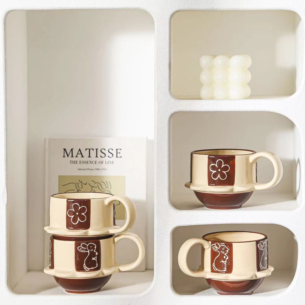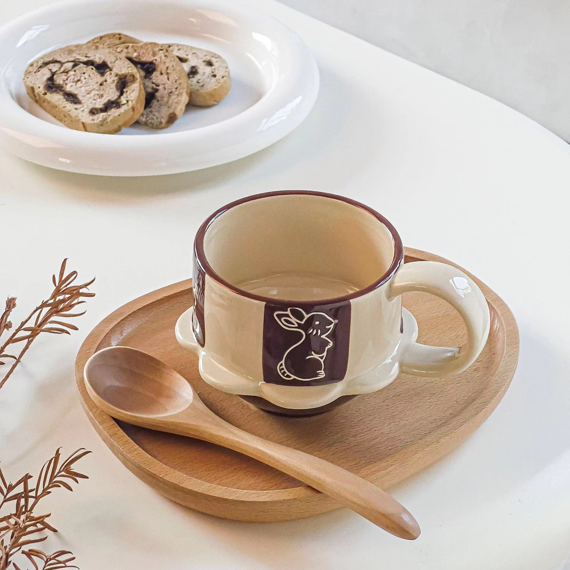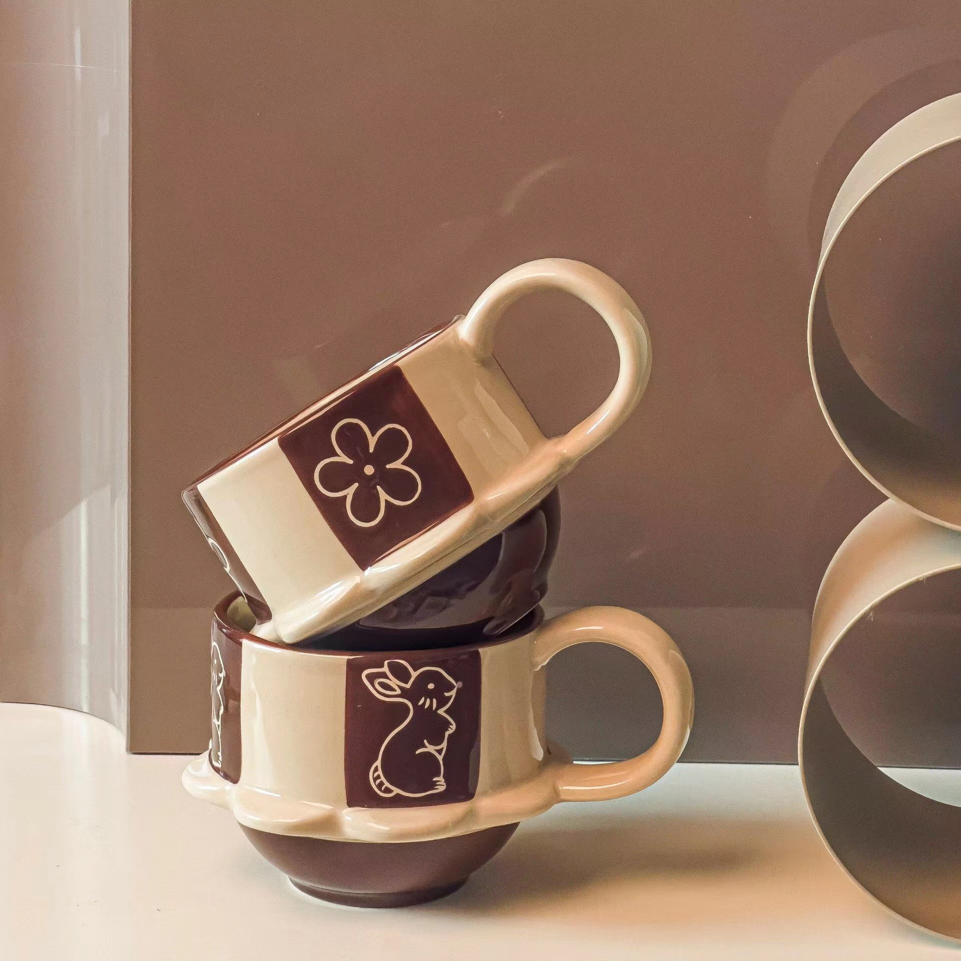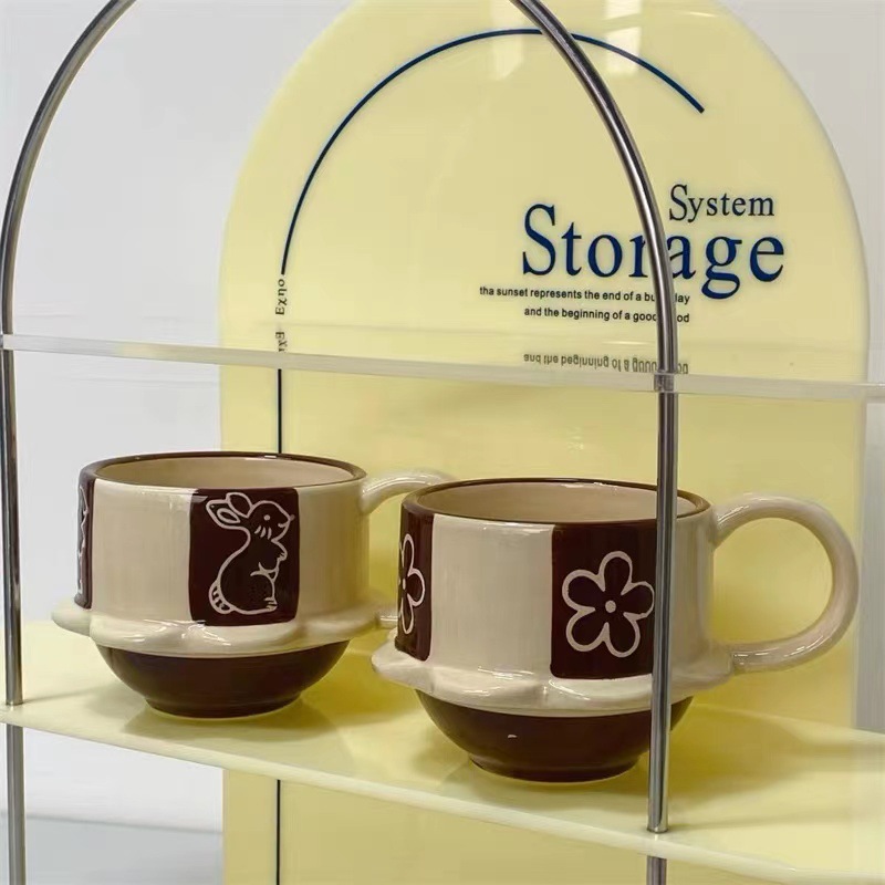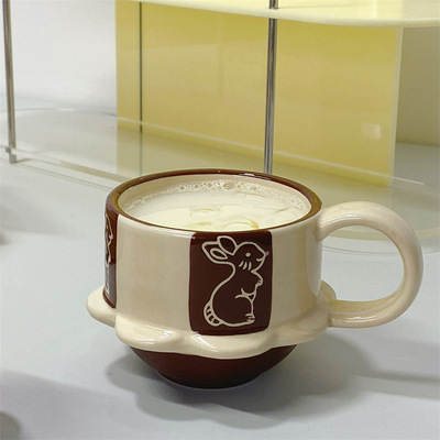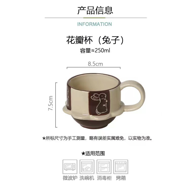 ceramic cup dish, japanese-style vintage high-foot ceramic mug, cute flowers and rabbit coffee cup, home use, vintage relief carving
