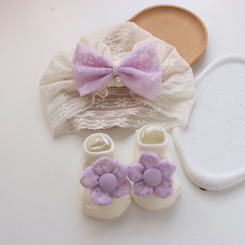 purple velvet bow beige fine grain lace decor hat + socks