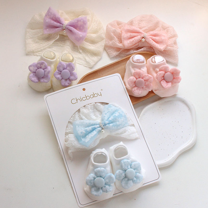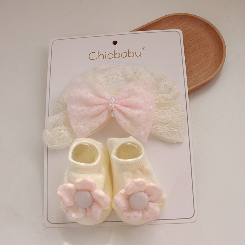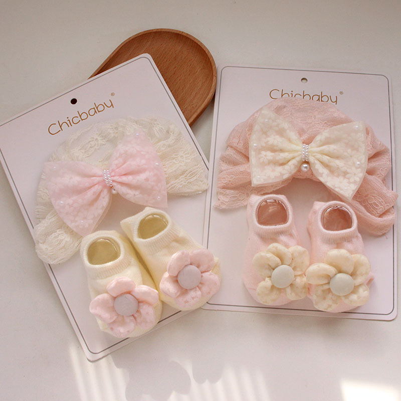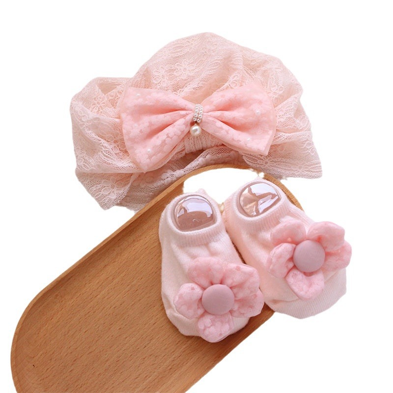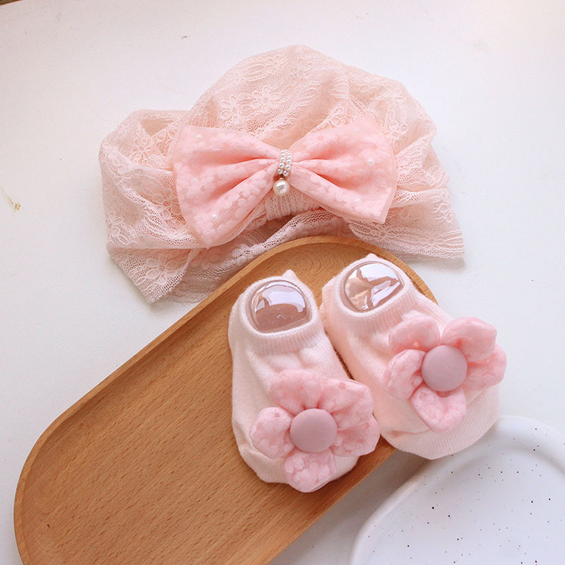 rice flower velvet bow pink fine lines lace decor hat + socks