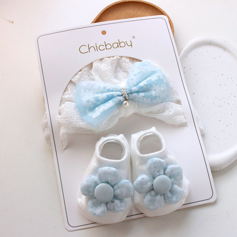 blue velvet bow white fine lines lace decor hat + small socks