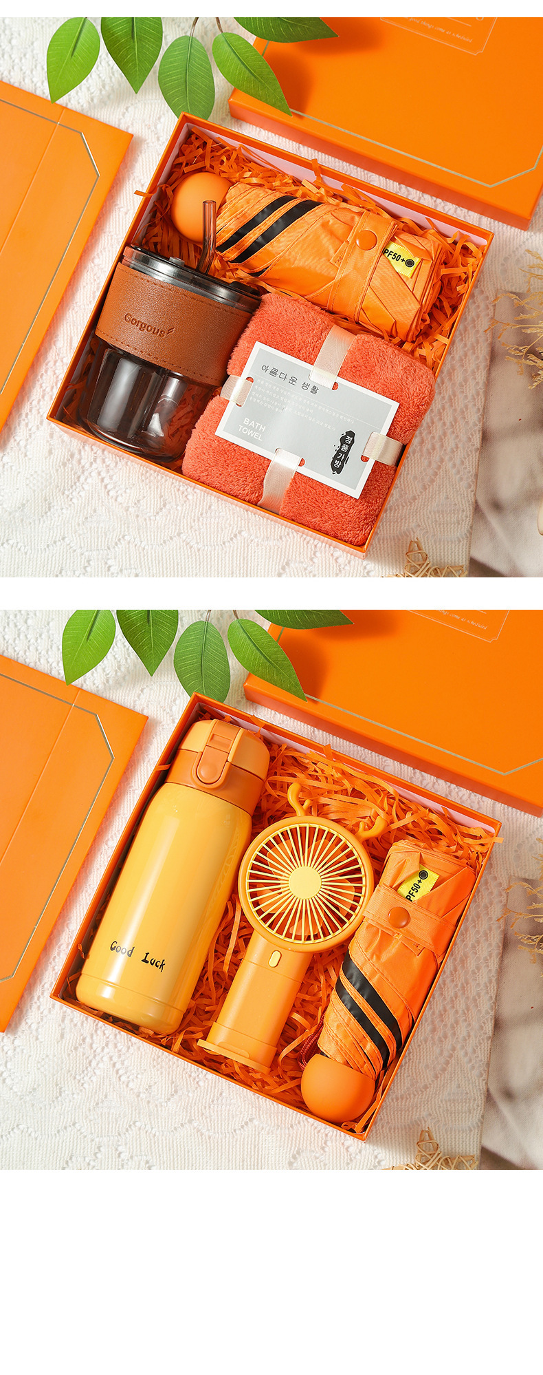 [orange gift box + gift bag] thermos cup + sun umbrella + little fan