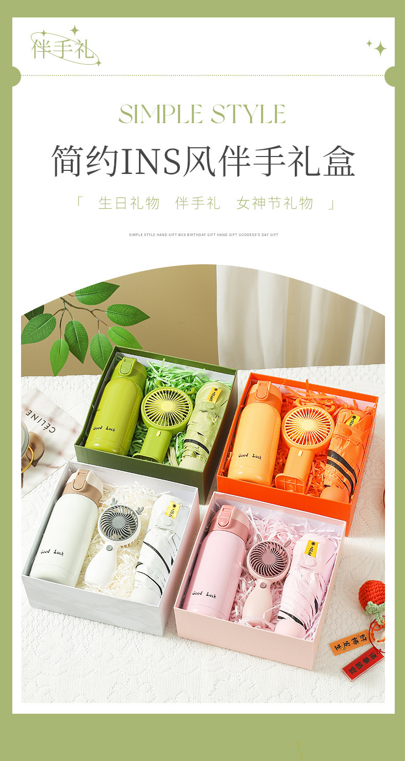 [white gift box + gift bag] thermos cup + sun umbrella + little fan