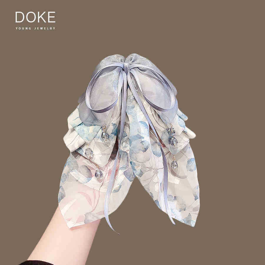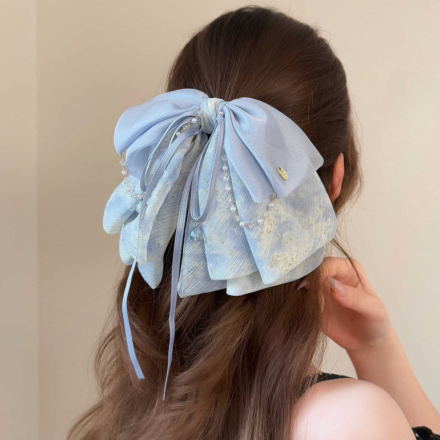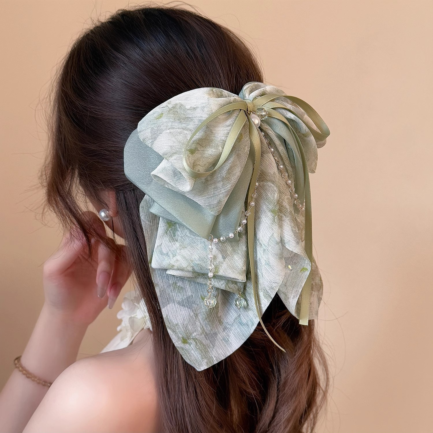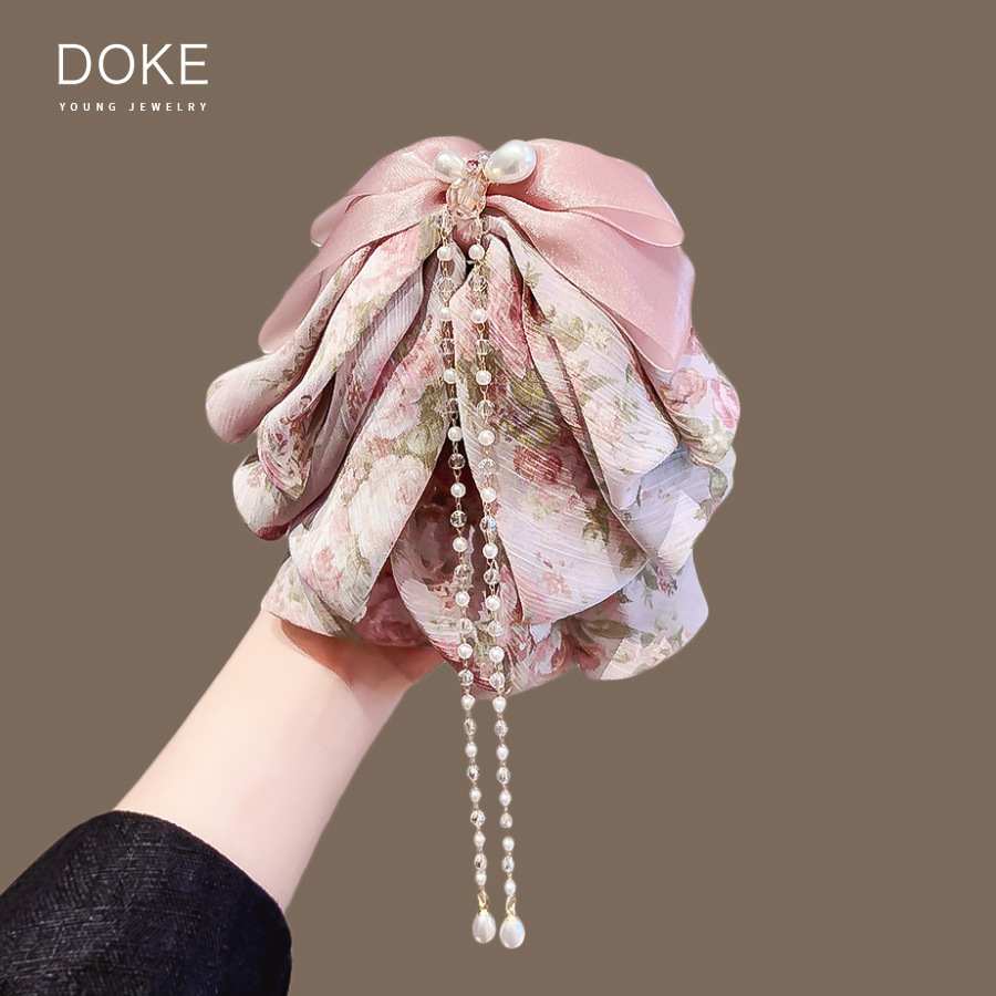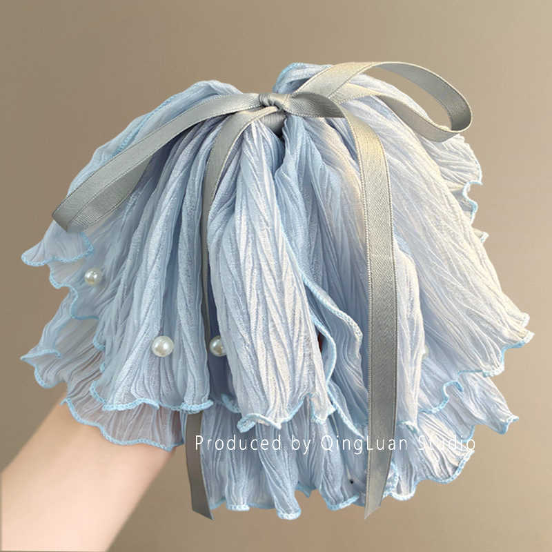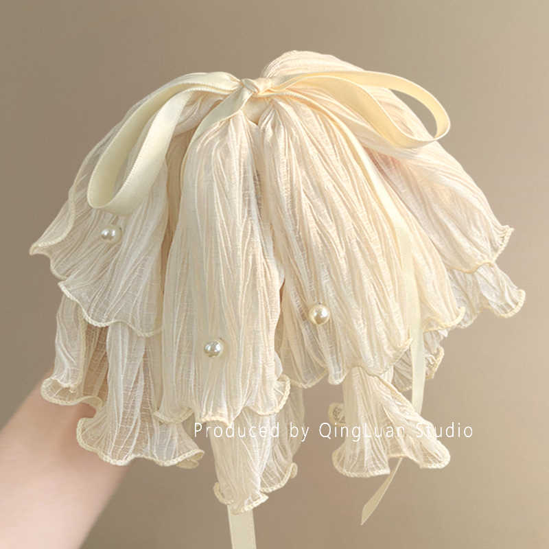 romantic france-beige chiffon pleated pearl ponytail clip