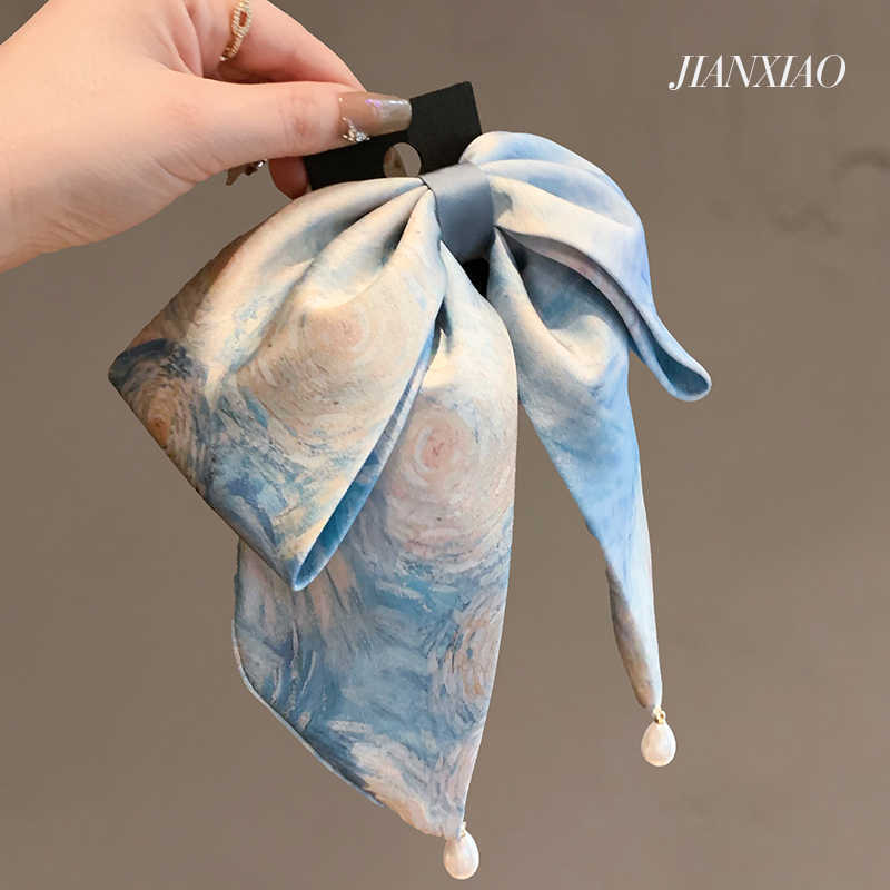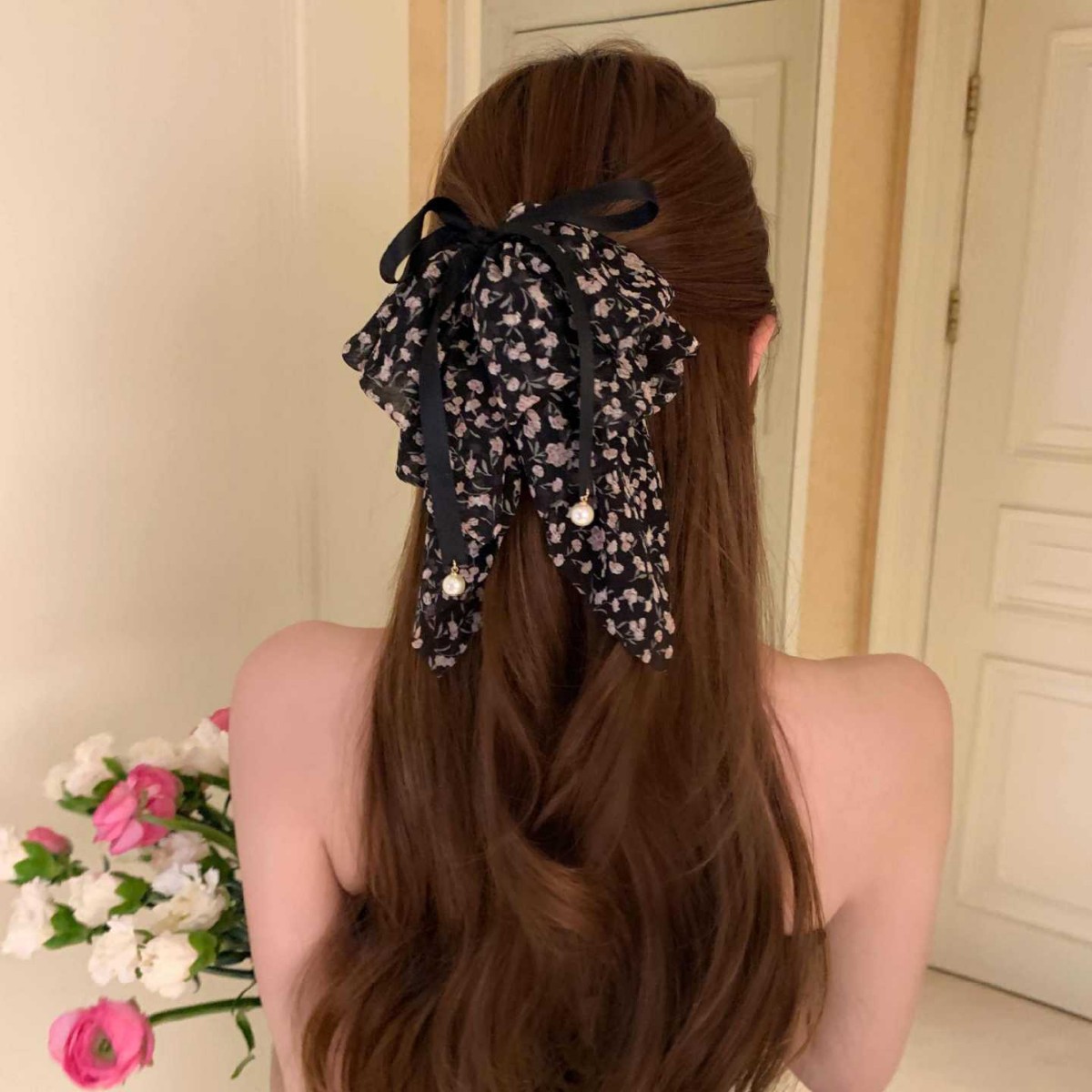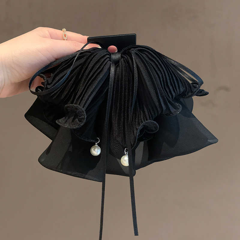 romantic france-black chiffon pleated pearl ponytail clip