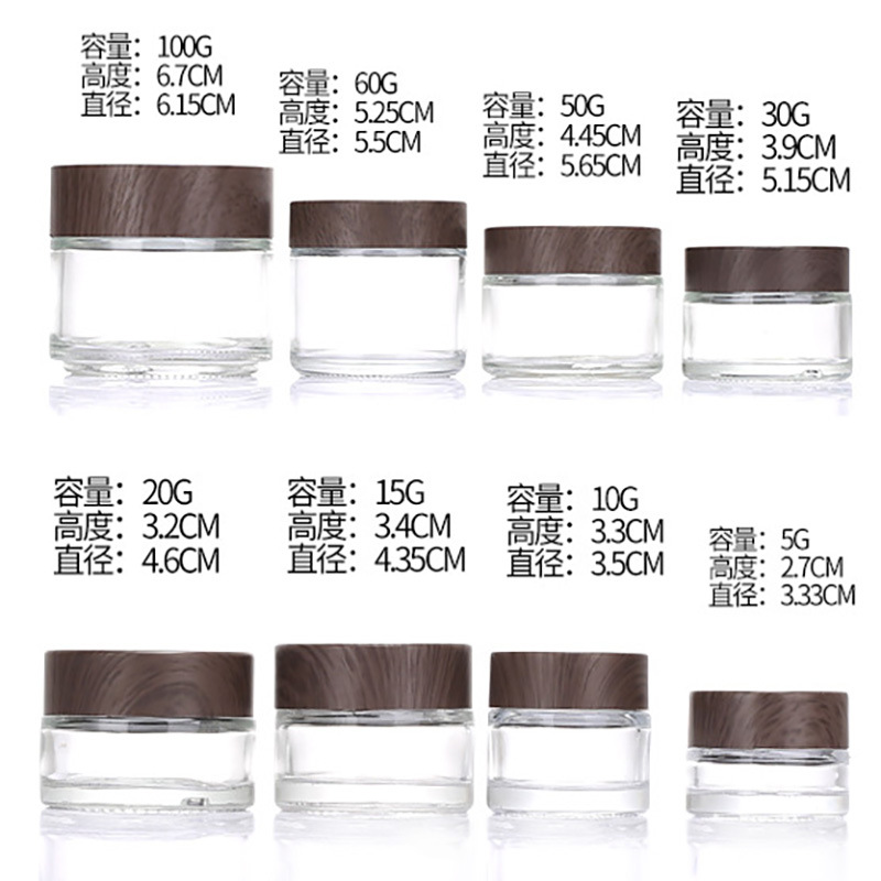 5g; brown wood cover + transparent cream bottle; glass