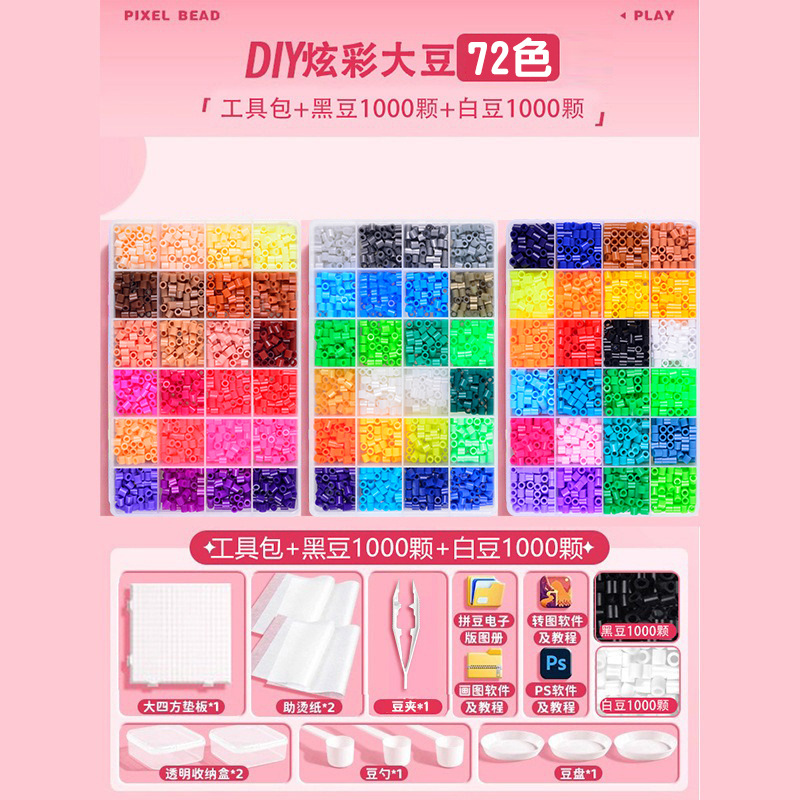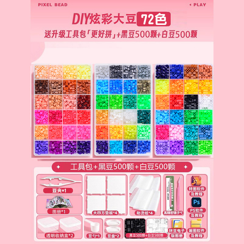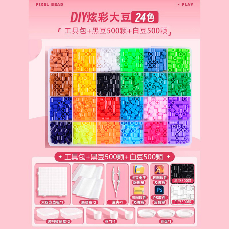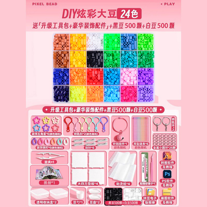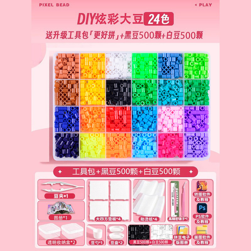 24 colors, plus an upgraded tool kit, deluxe decorative accessories, and a free 1,000-piece set of black-and-white beans.