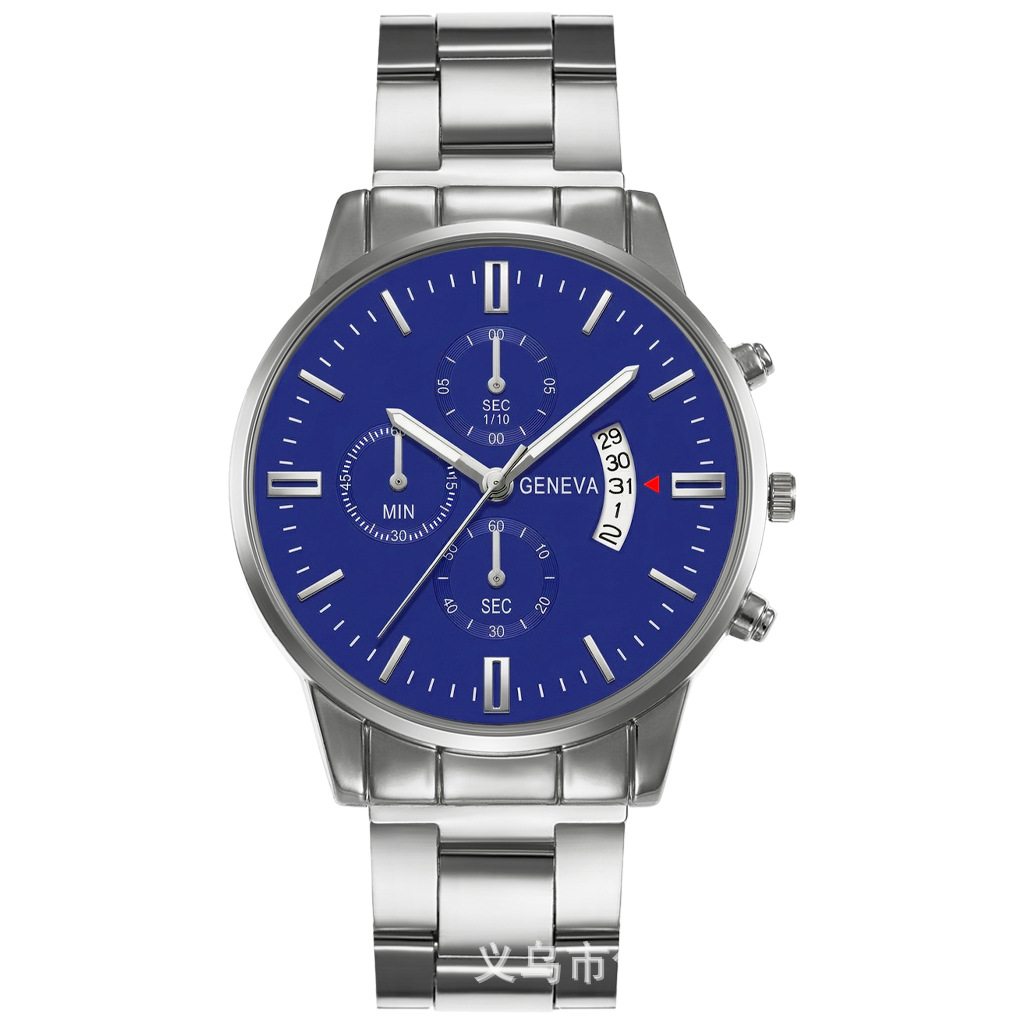 blue dial, silver hands, black case, black strap