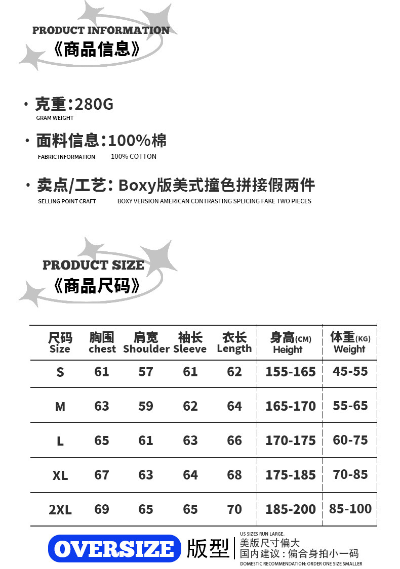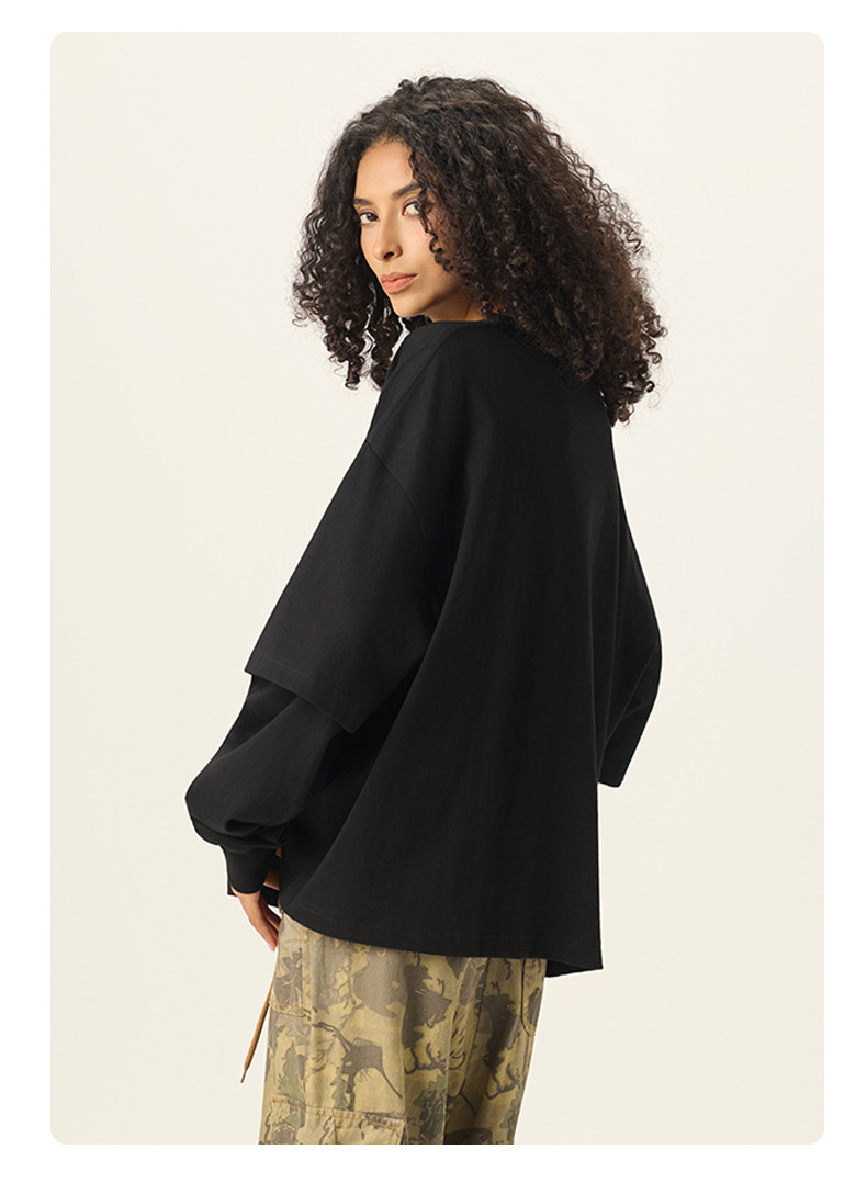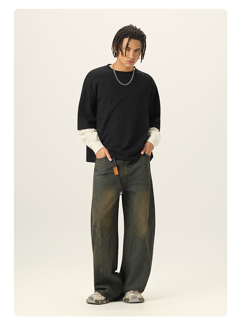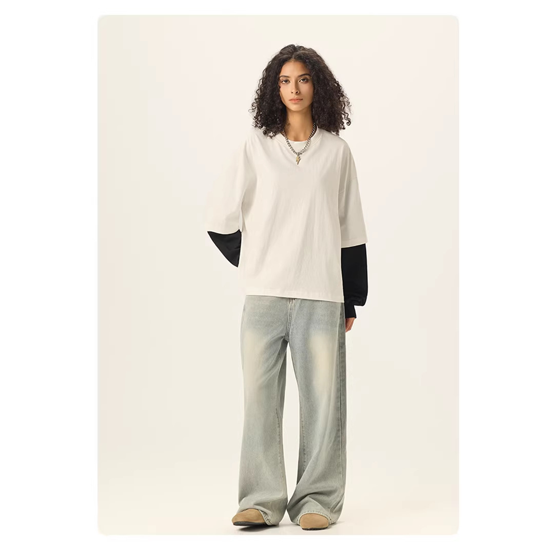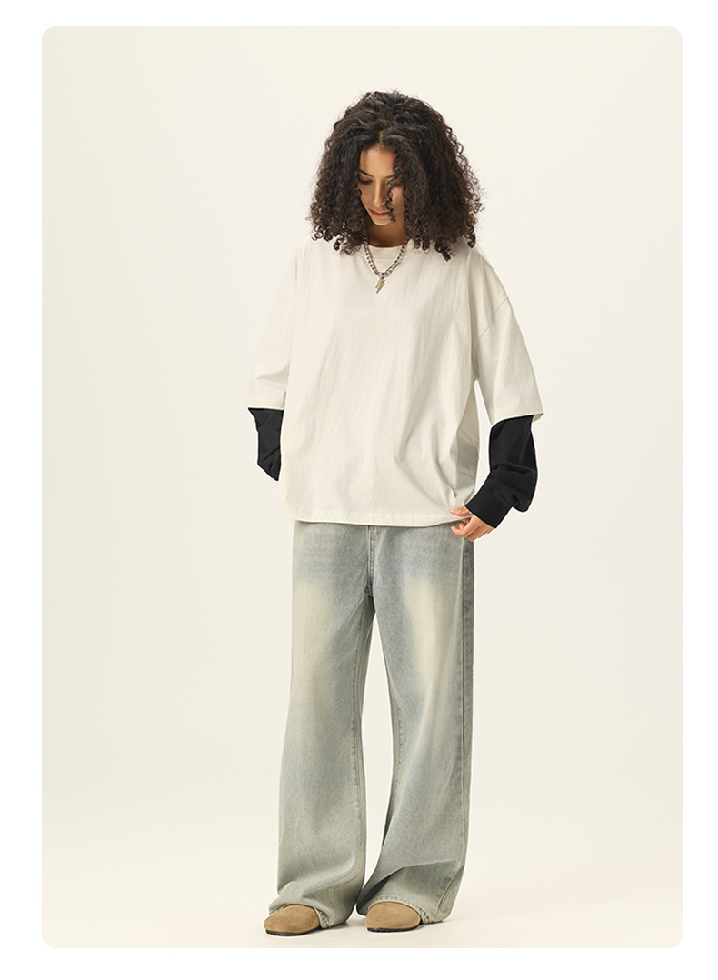 bubble rs men's clothing | cross-border fake two pieces color contrast long sleeve t-shirt g pure cotton short wide boxy american stitching long sleeve