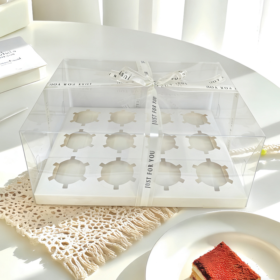 transparent 12-cup cup; white card + pet