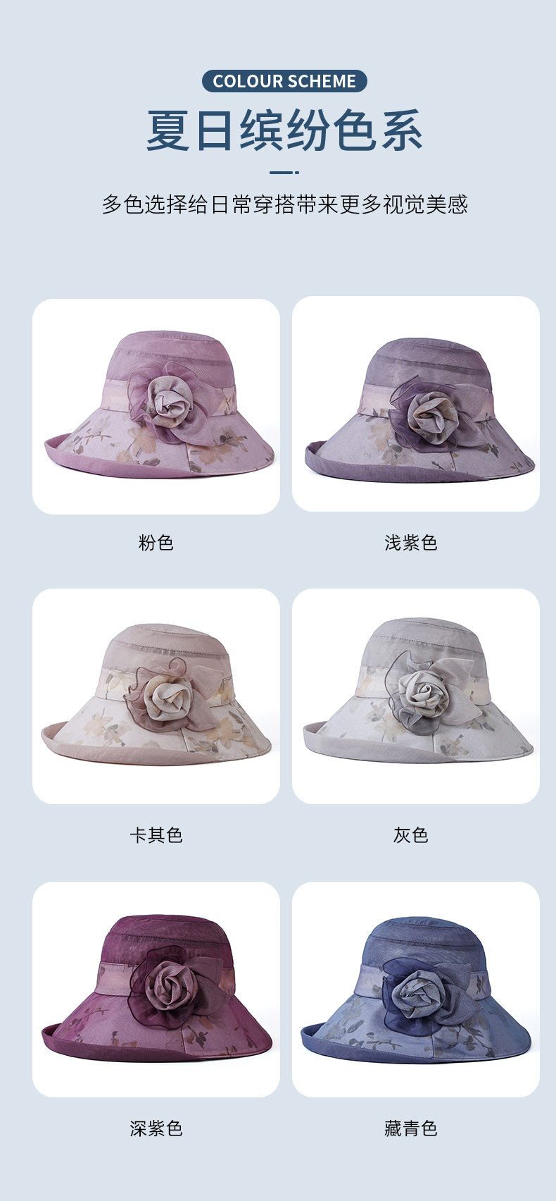 color: pink, gray, khaki, light purple, dark purple, navy blue