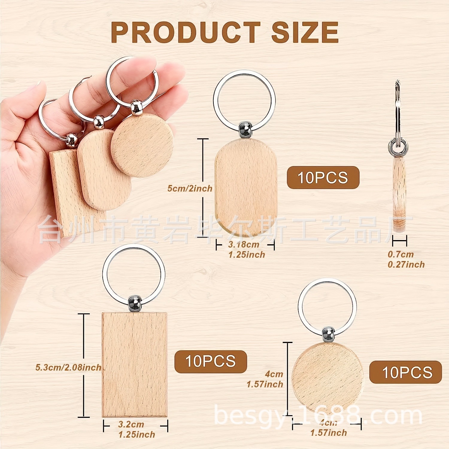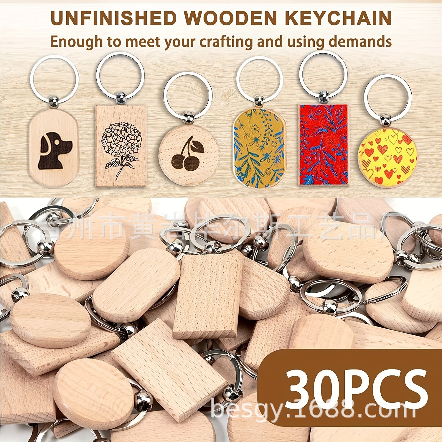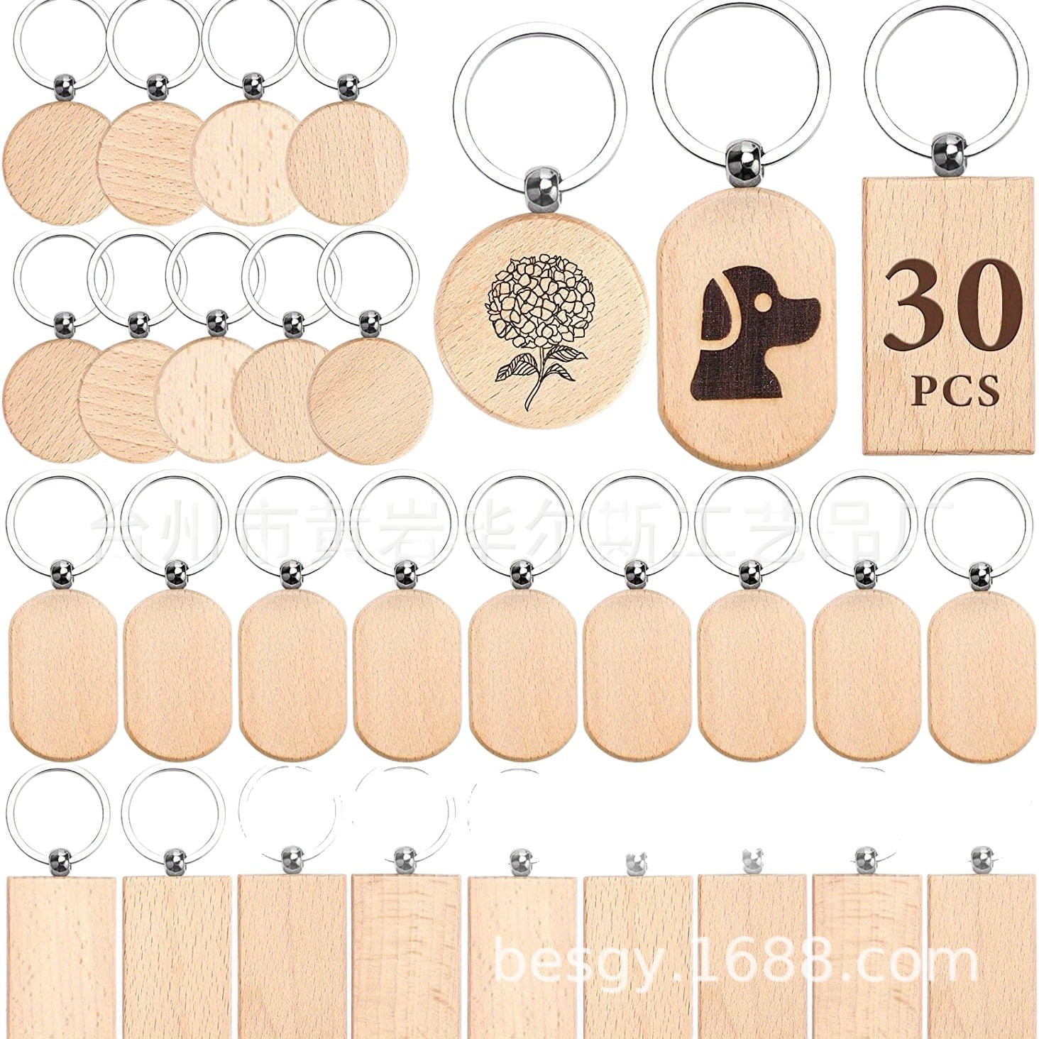 cross-border amazon hot sale 30 pieces beech keychain 3 shapes combination laser engraving round rectangle