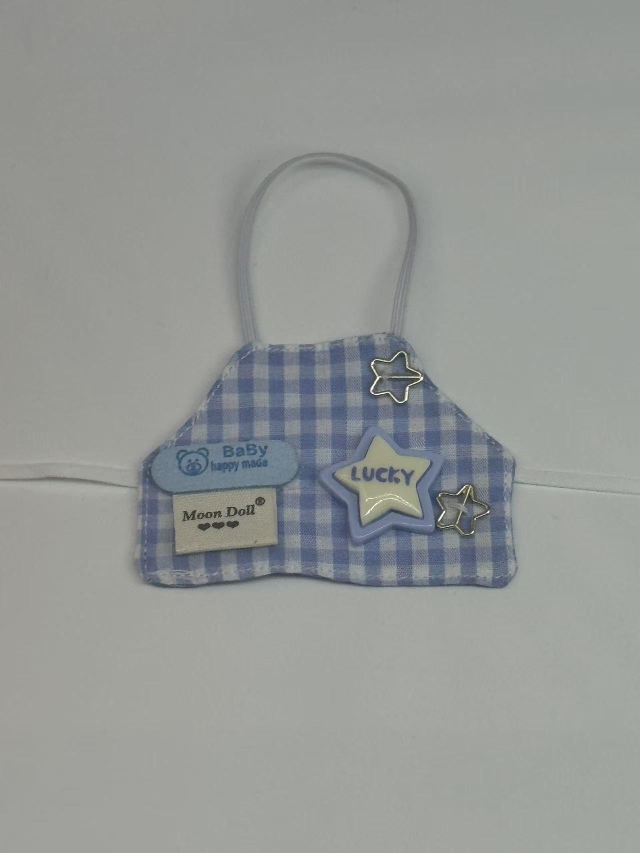 blue and white plaid apron with label