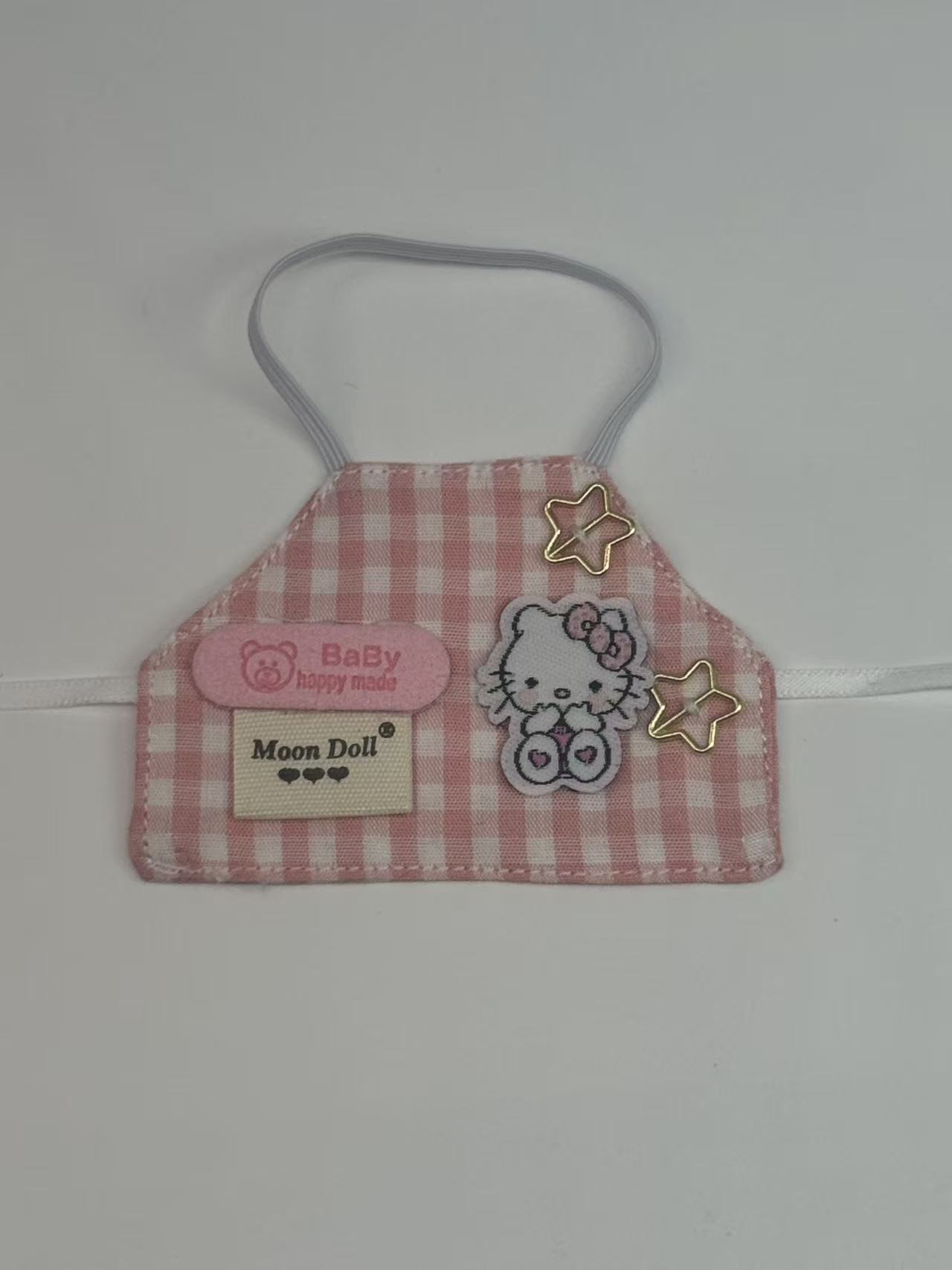 red and white plaid apron with label