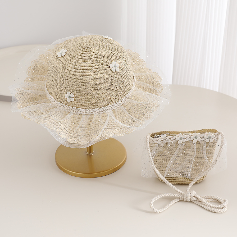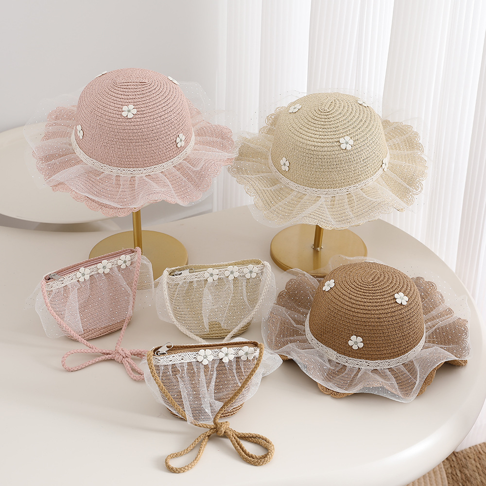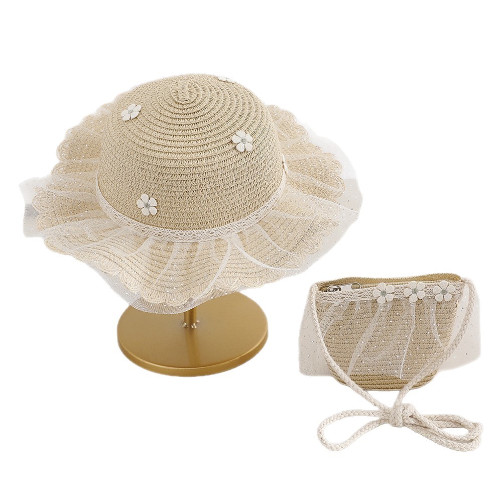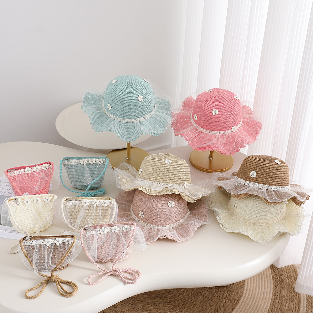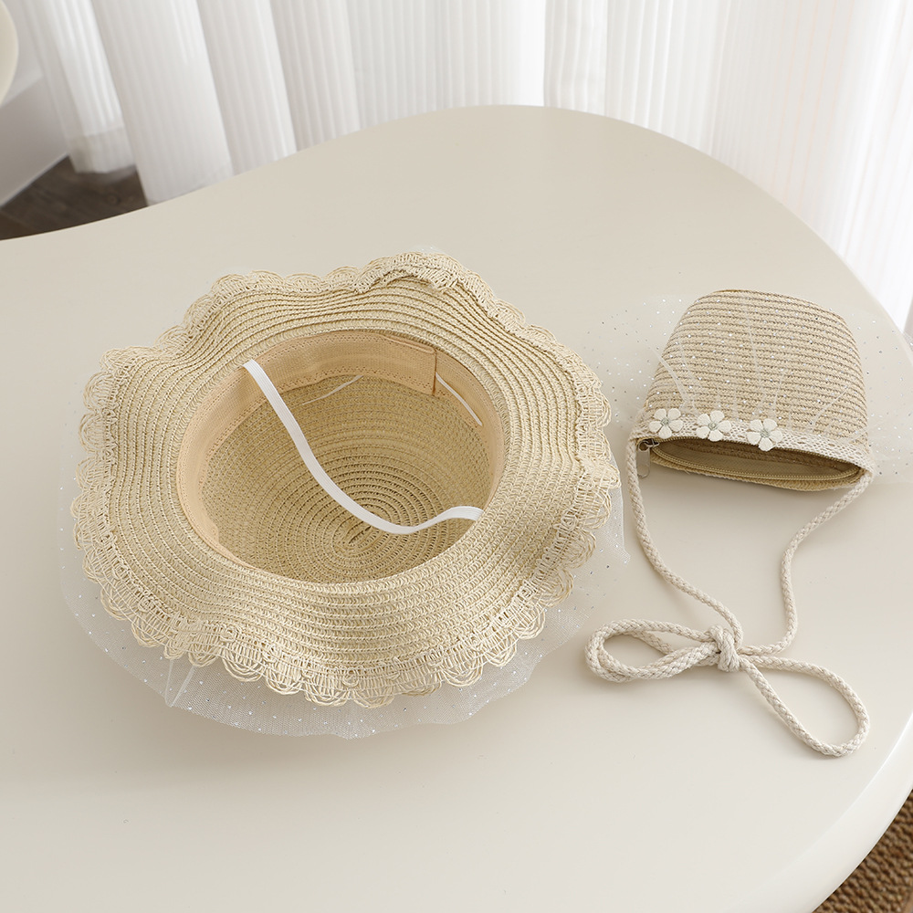 2026 new children's princess straw hat bag set girls mesh big brim sun protection hat travel straw cross body bag