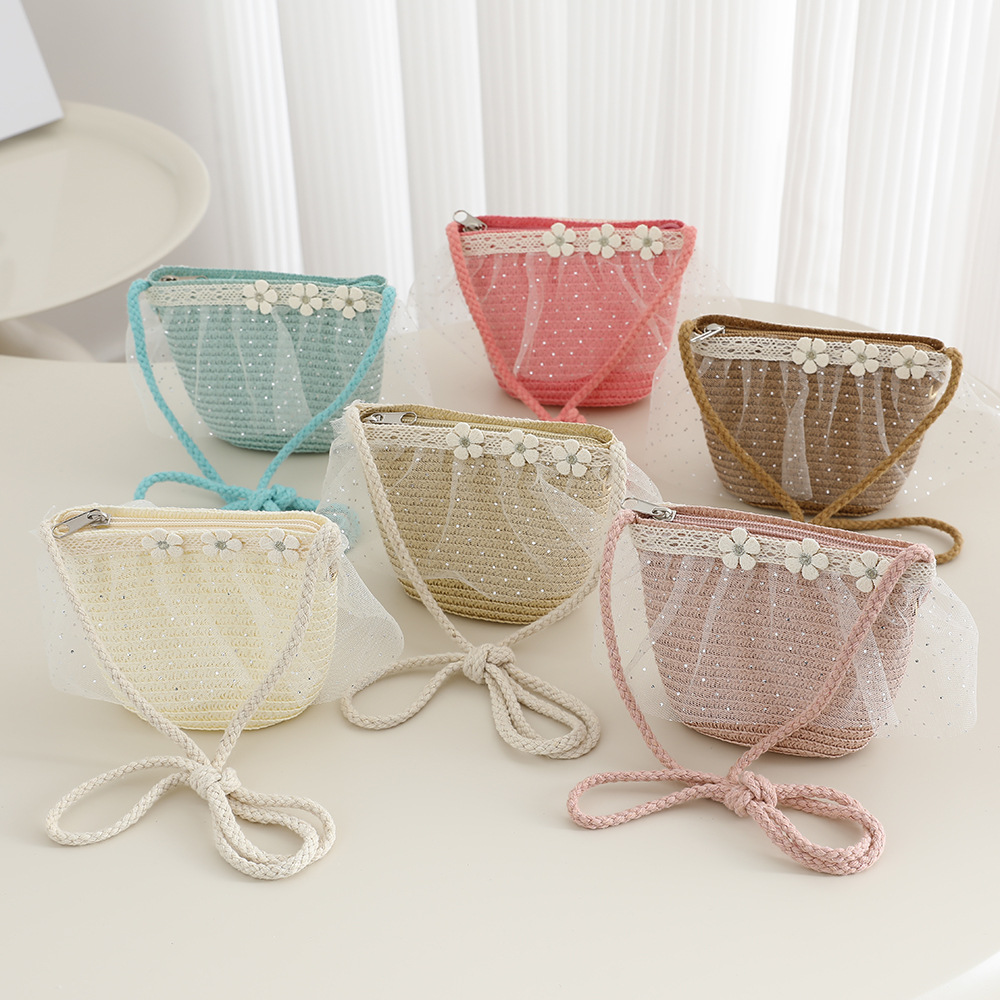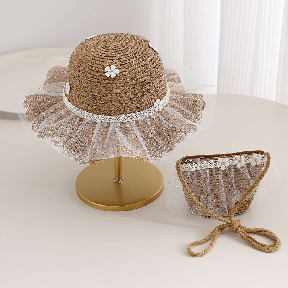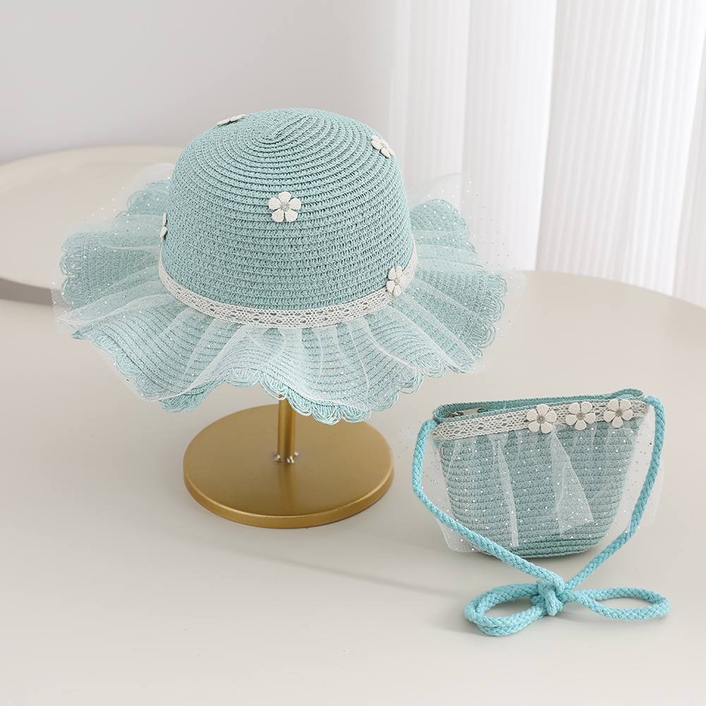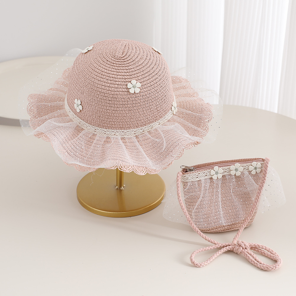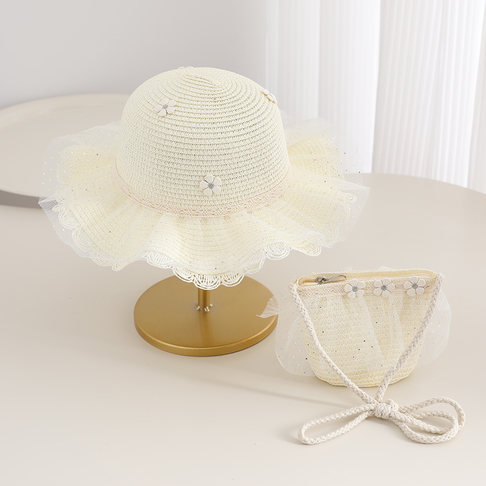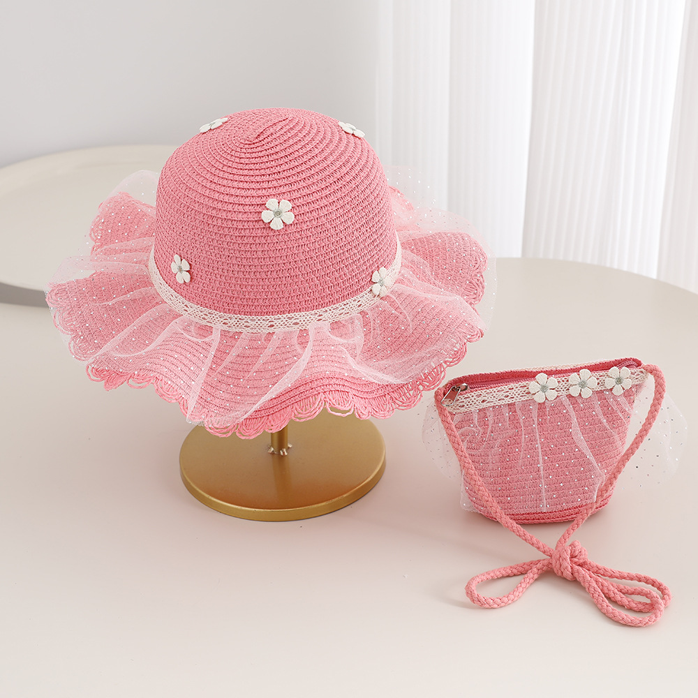 2026 new children's princess straw hat bag set girls mesh big brim sun protection hat travel straw cross body bag