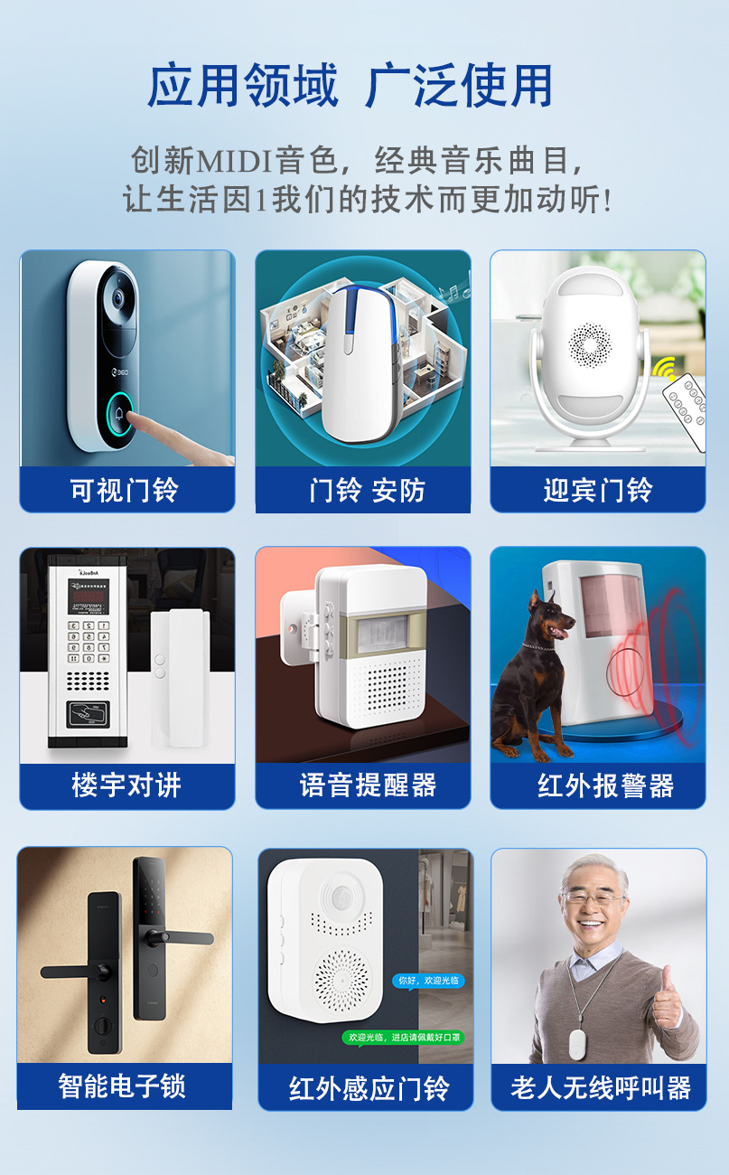 product description: wireless doorbell, door lock, security monitoring, smart alarm clock