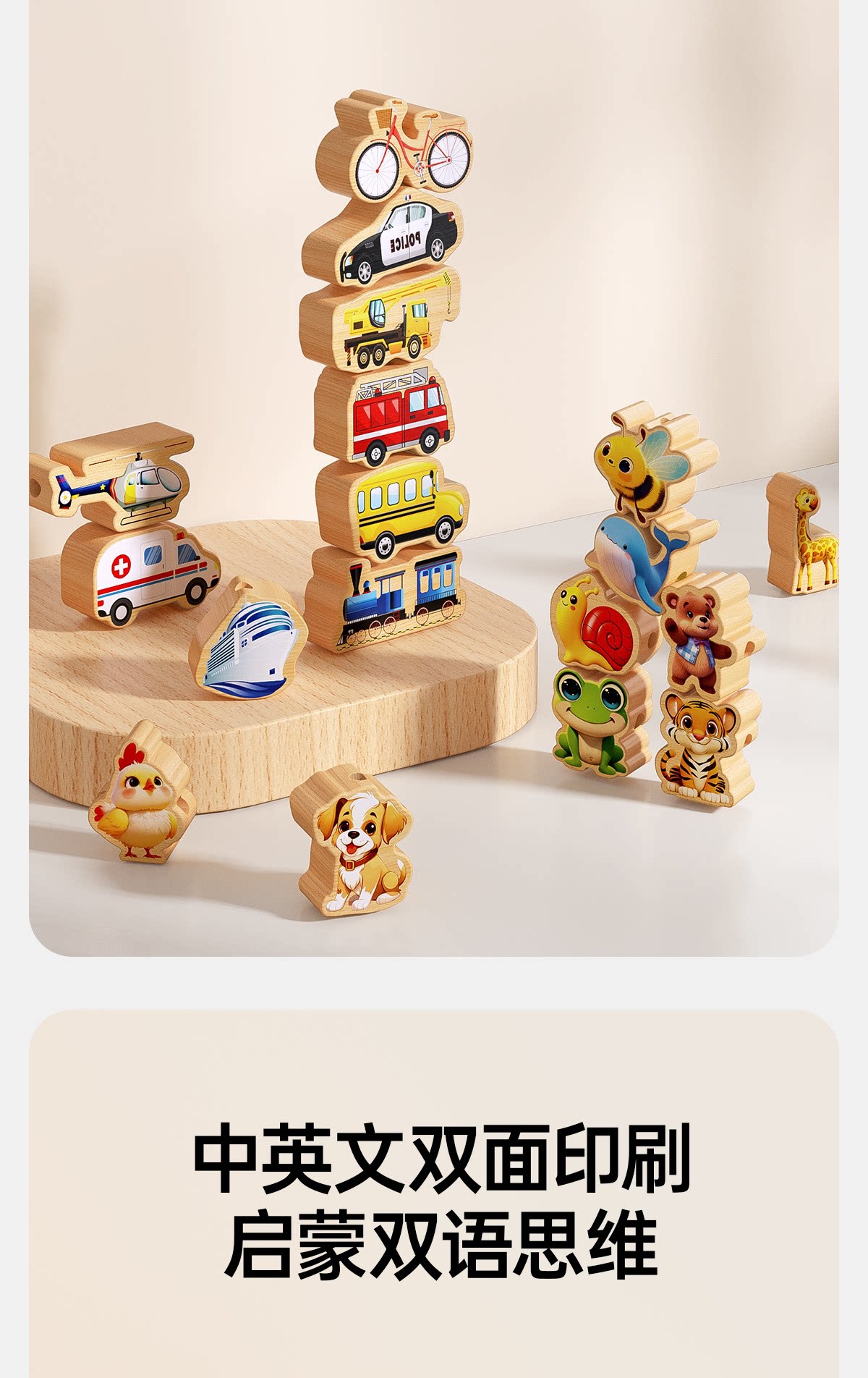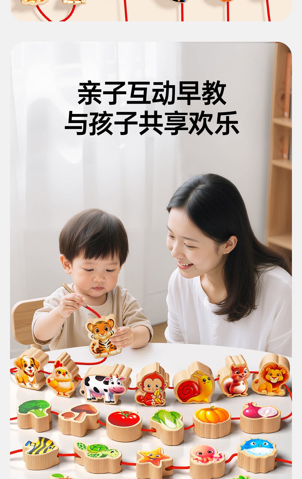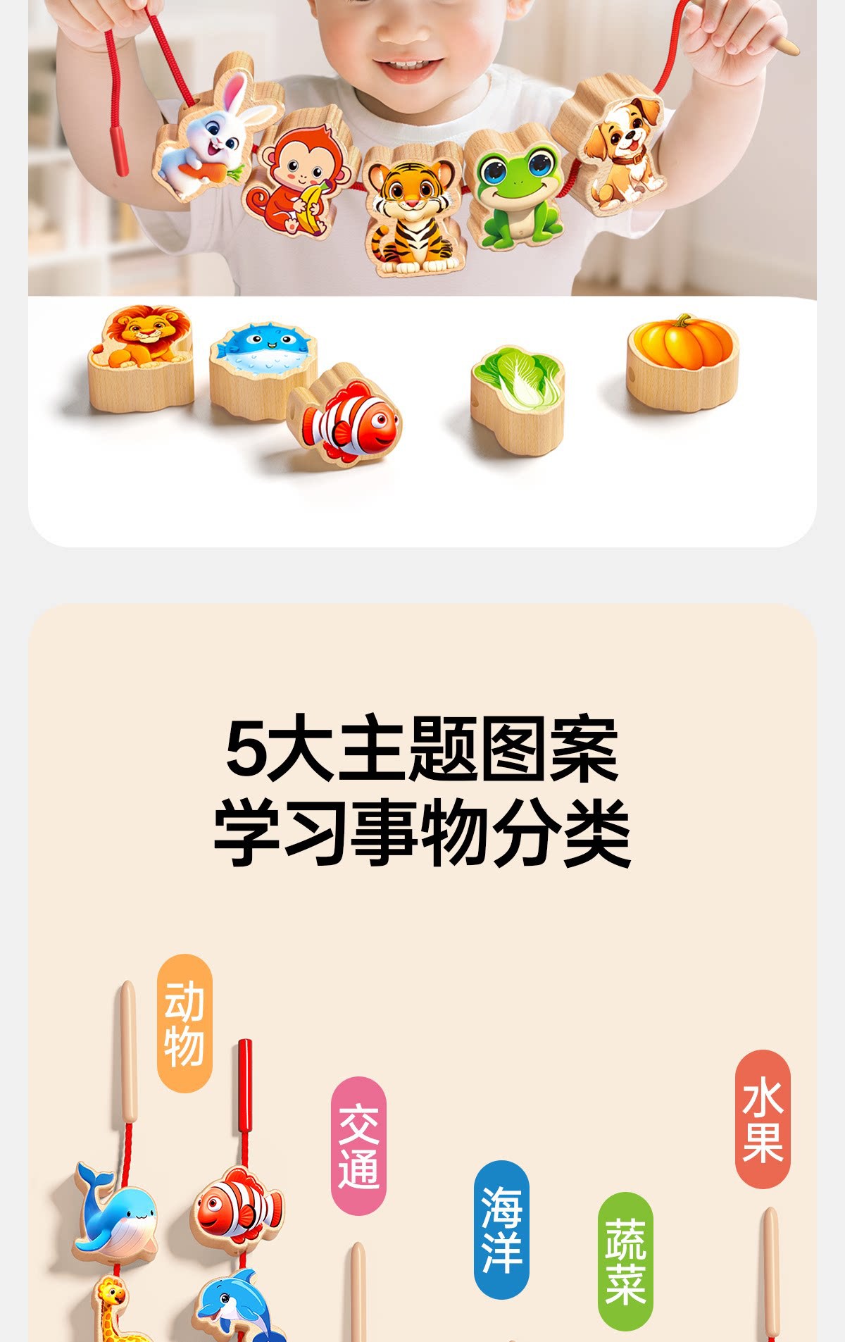 solid wood large-bead stringing toy with 81 beads [fruits + animals + vegetables + vehicles + marine life +8 strings] in a storage box
