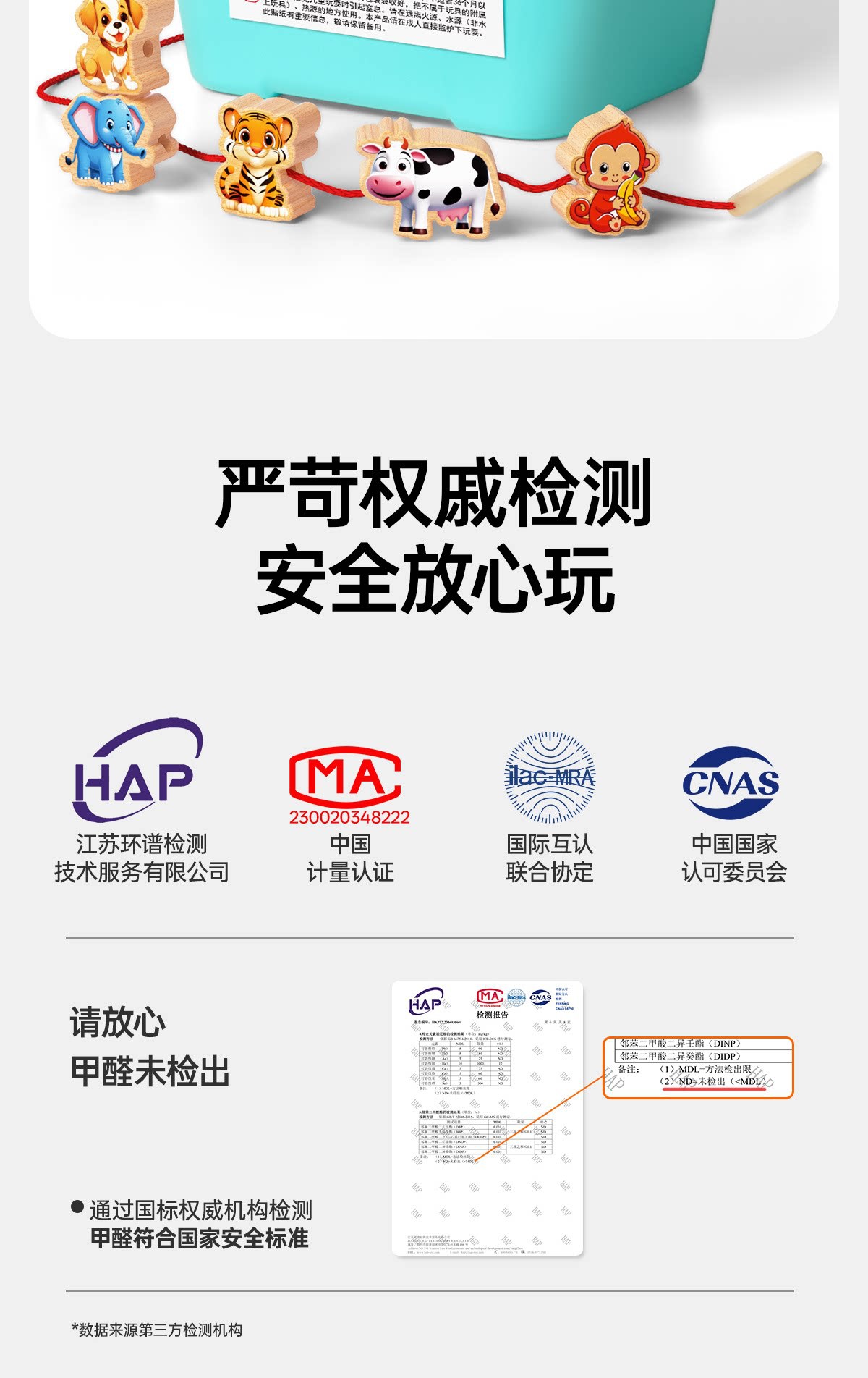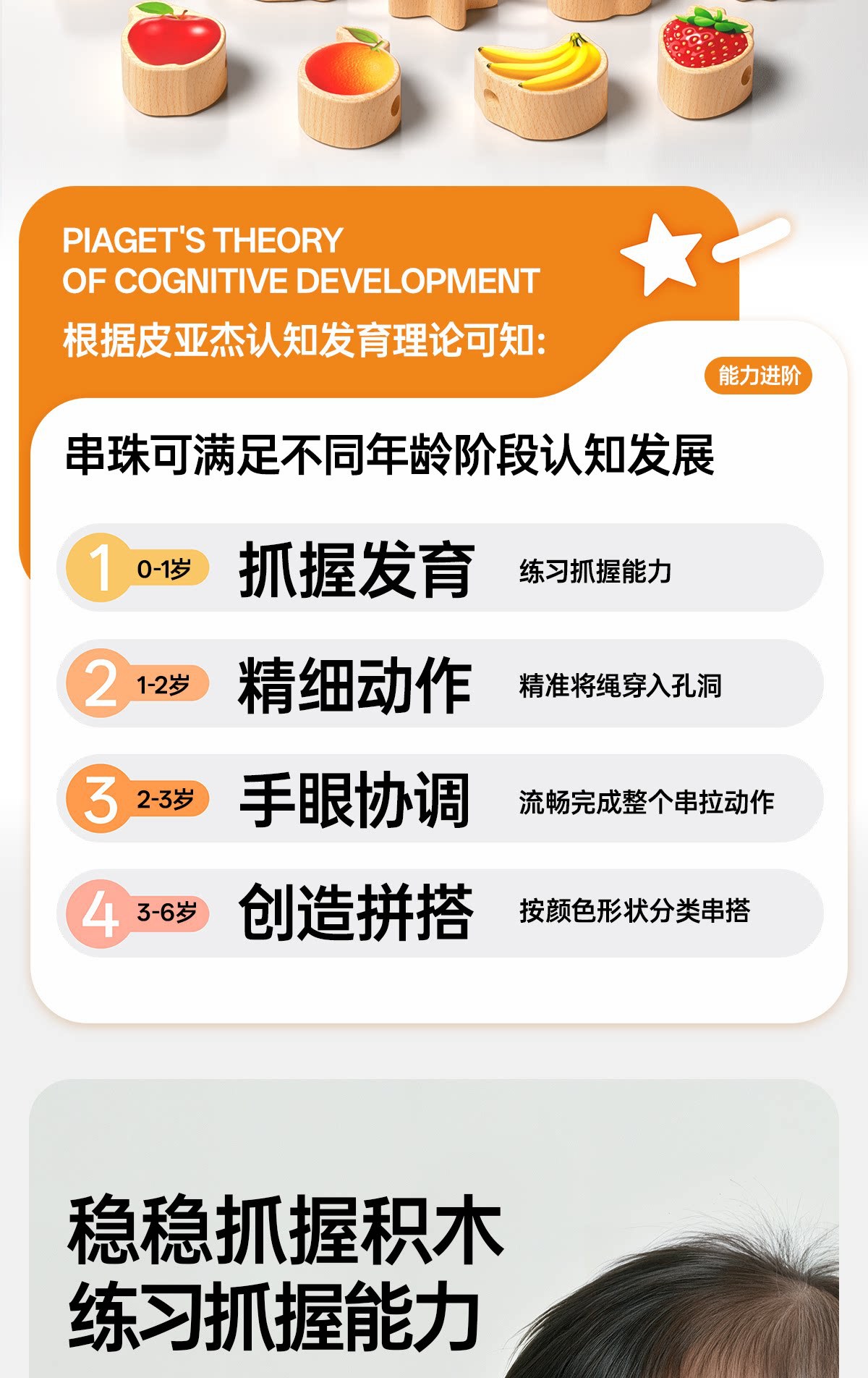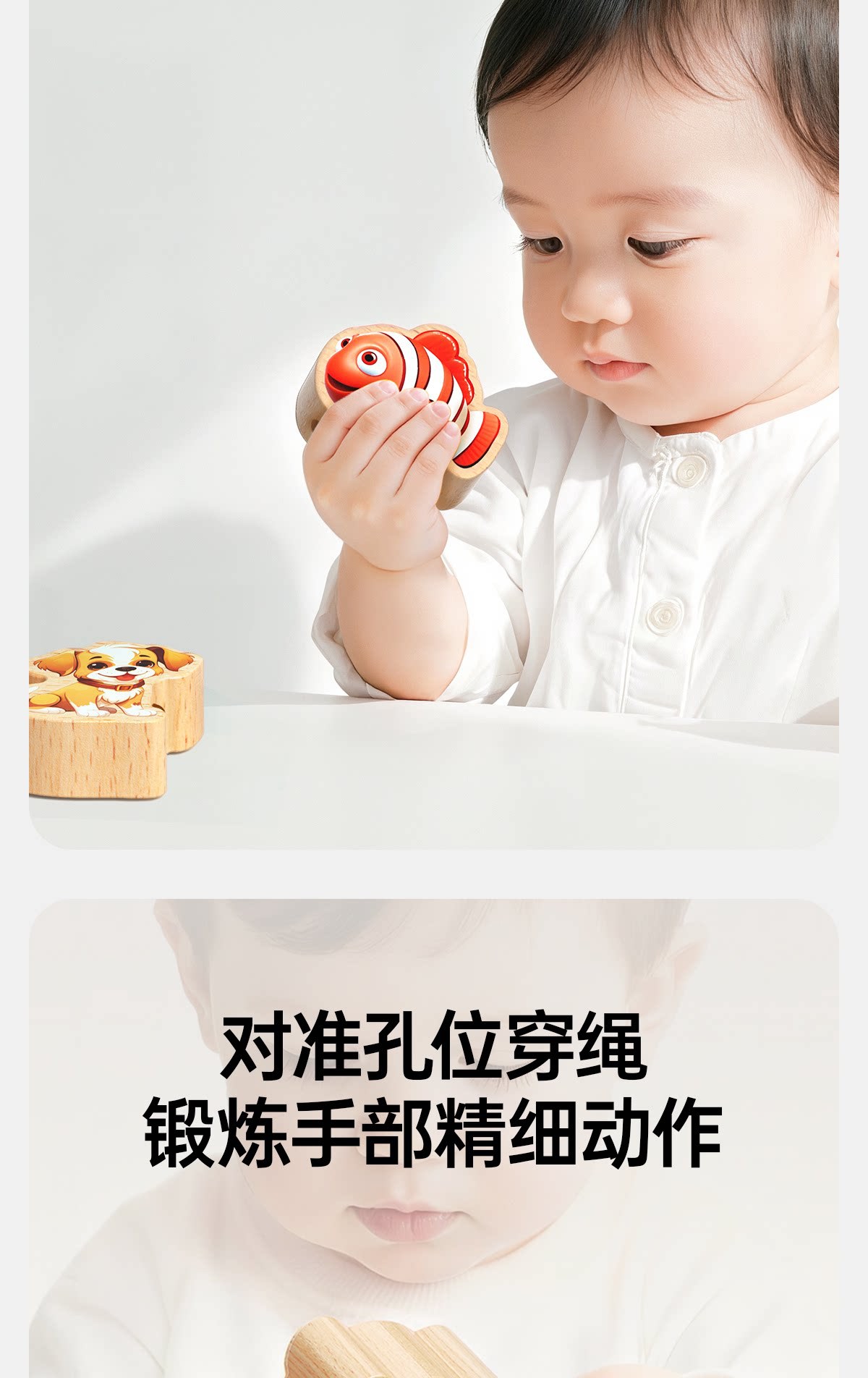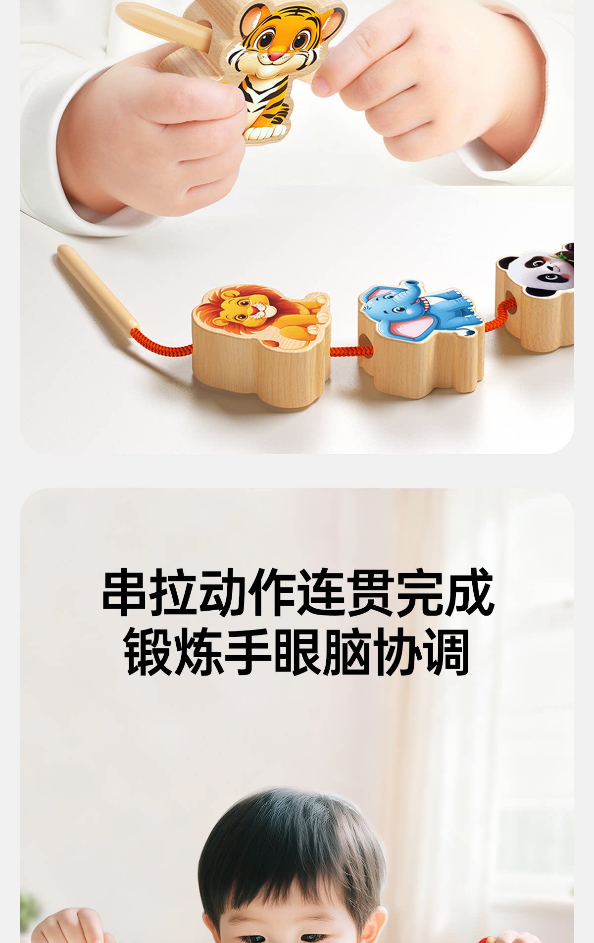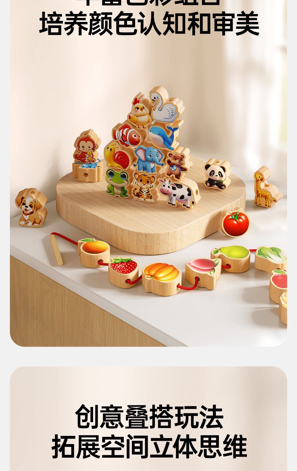 solid wood large-bead stringing set with 42 beads [fruits + animals +4 strings] in a storage box