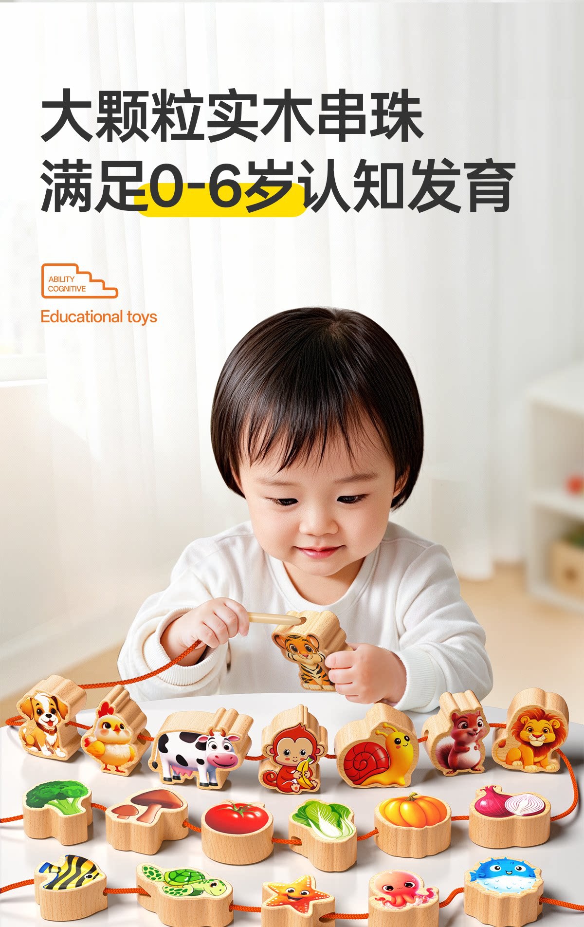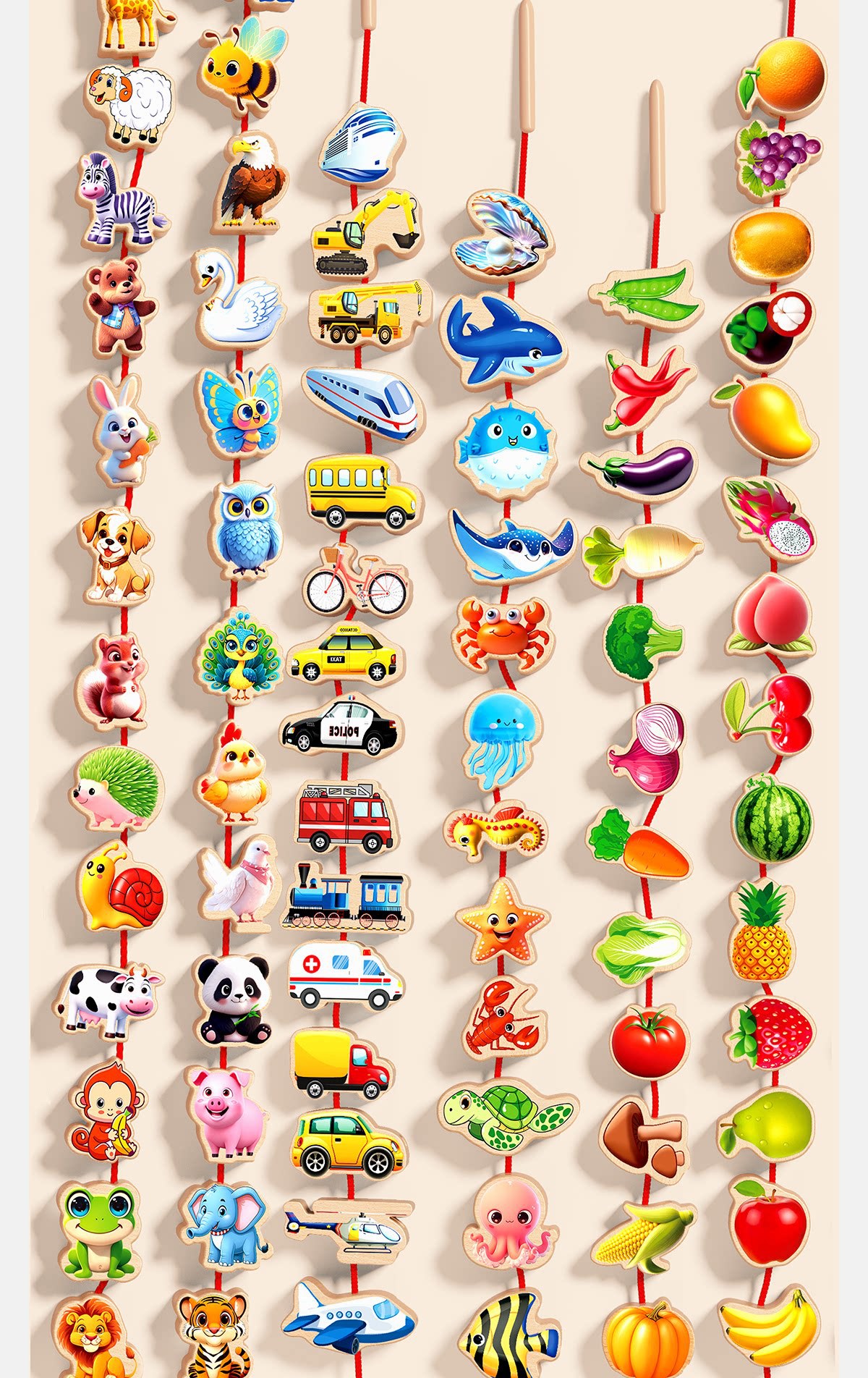 solid wood large-bead stringing toy with 81 beads [fruits + animals + vegetables + vehicles + marine life +8 strings] in a bag