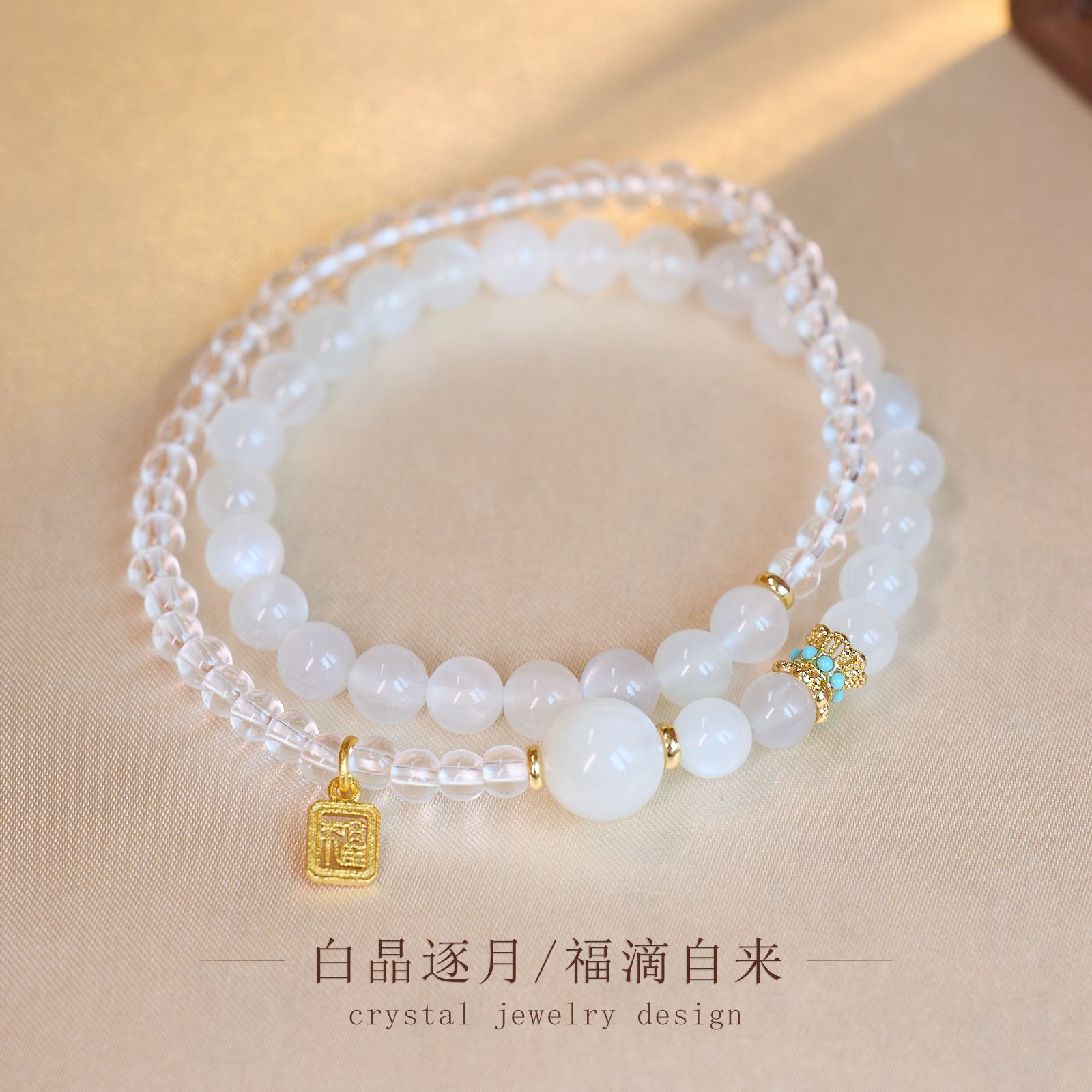 6mm white moonlight white crystal b fu character drip double ring bracelet