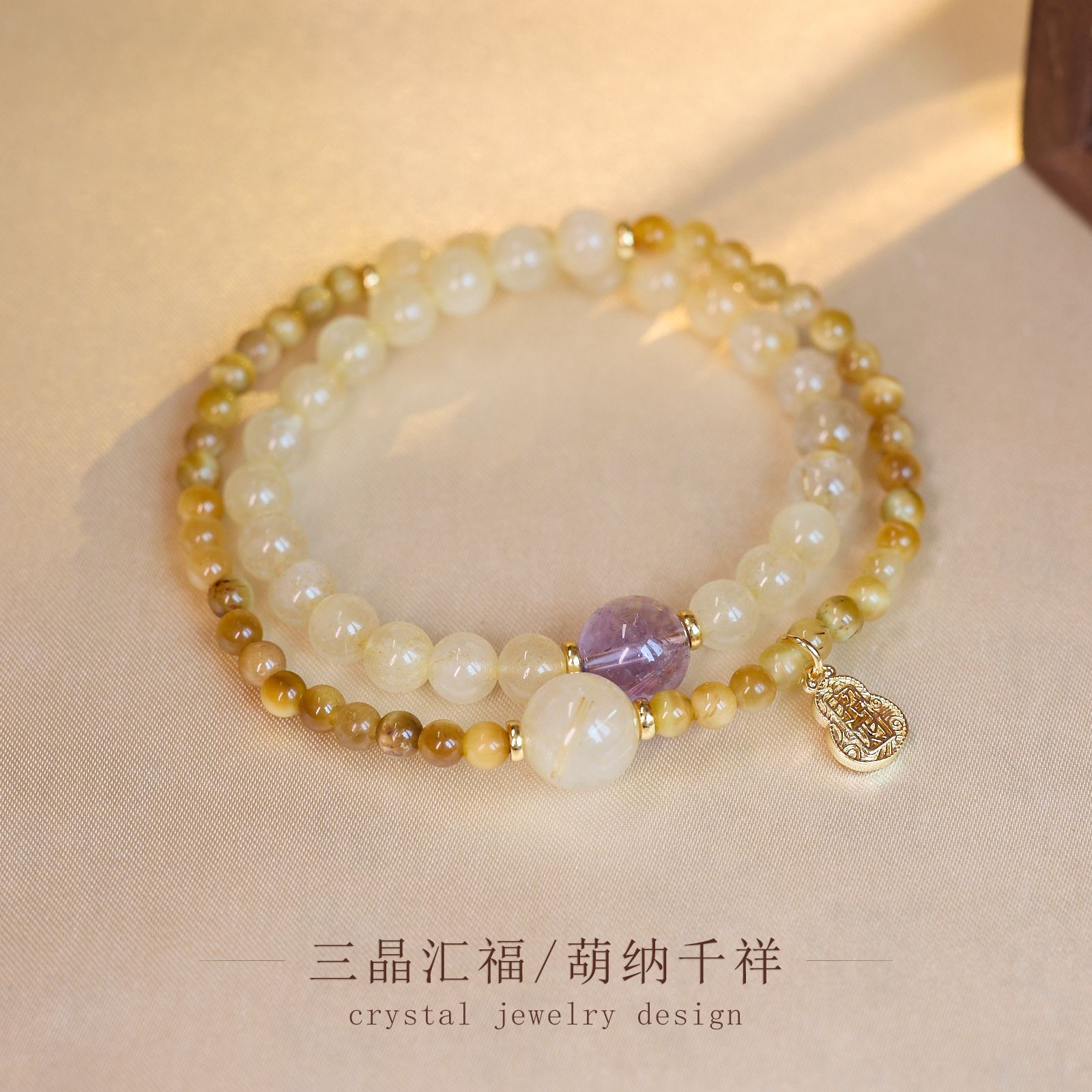 4mm gold tiger eye 6mm gold rutilated quartz amethyst lucky gourd double ring bracelet