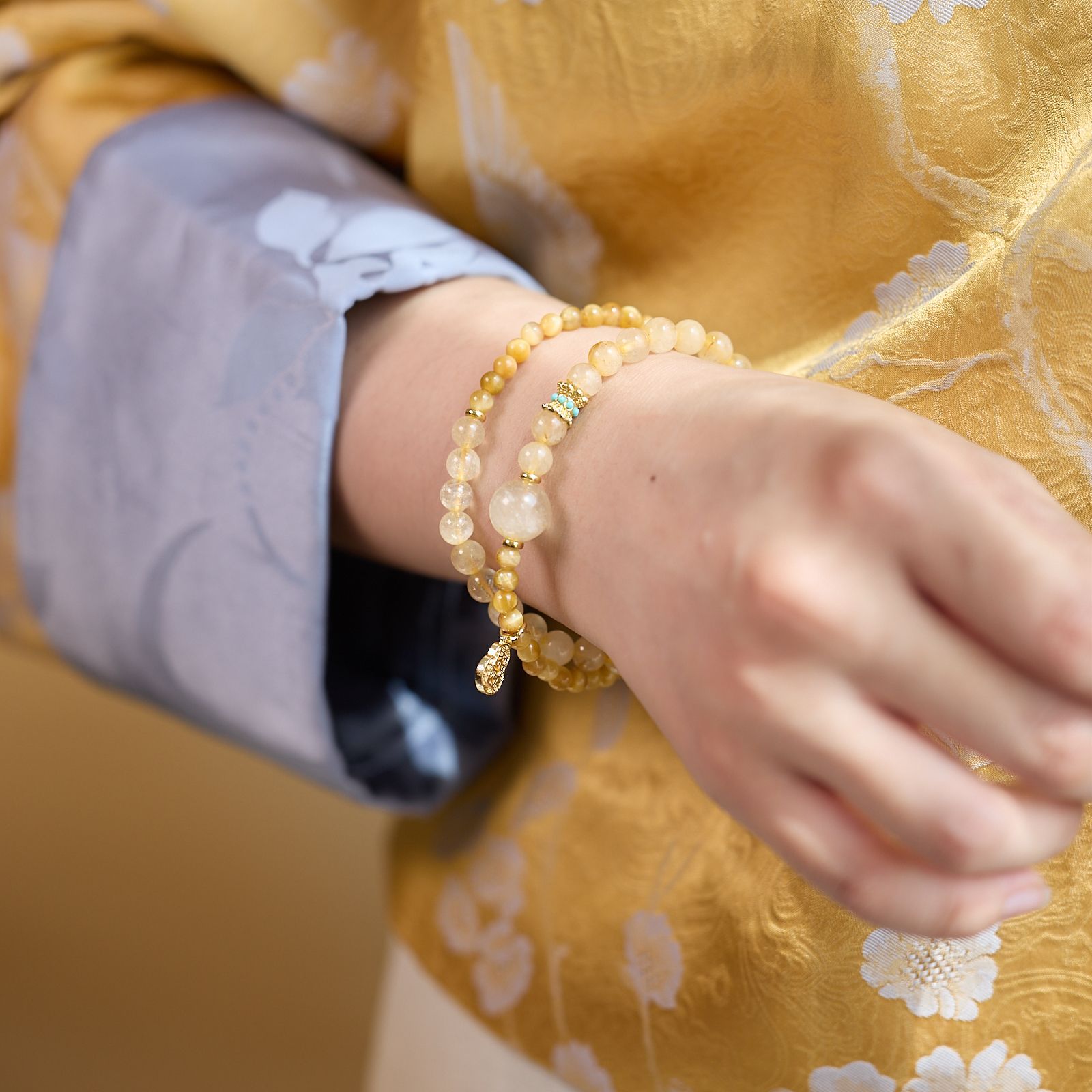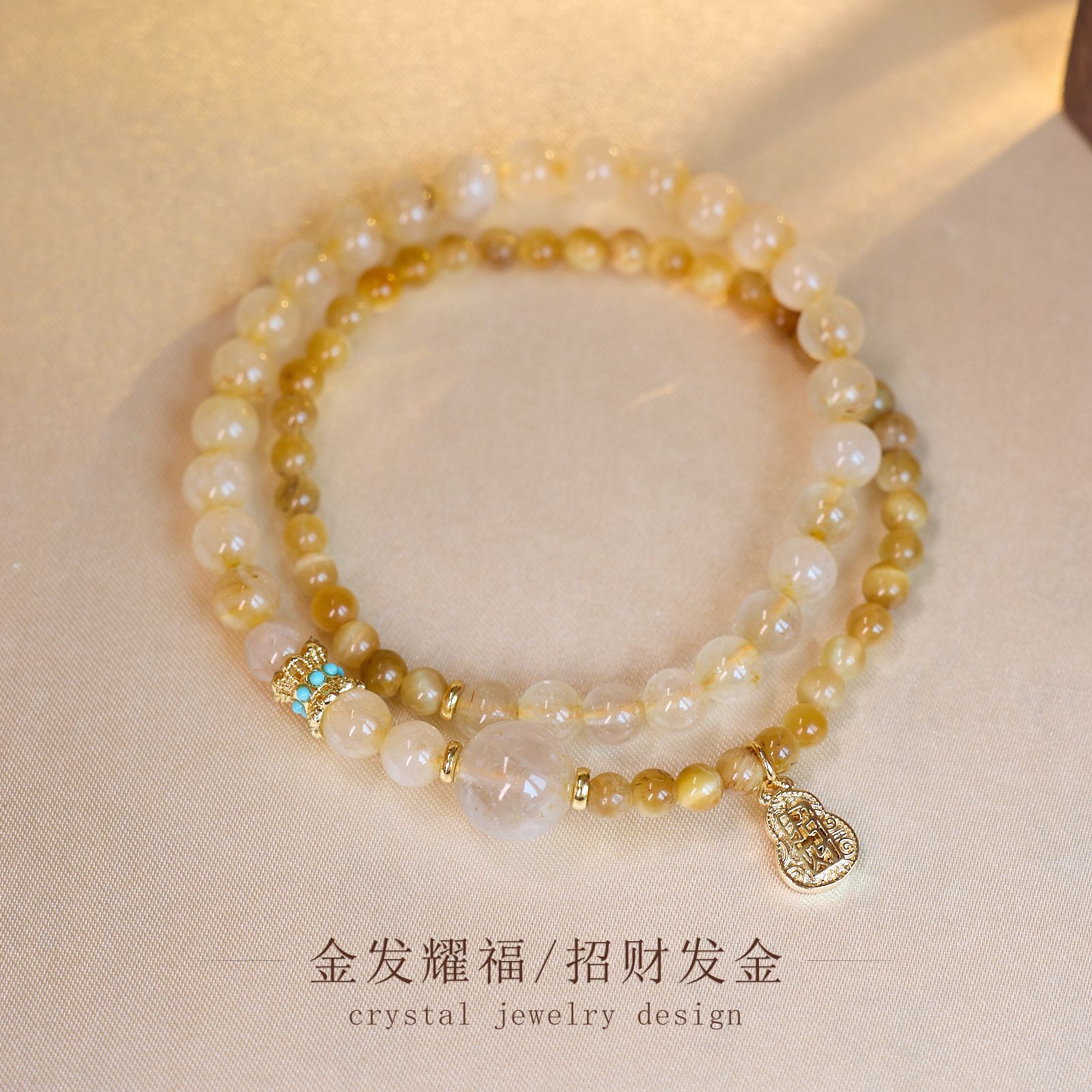 4mm gold tiger eye 6mm gold rutilated quartz lucky gourd double ring bracelet