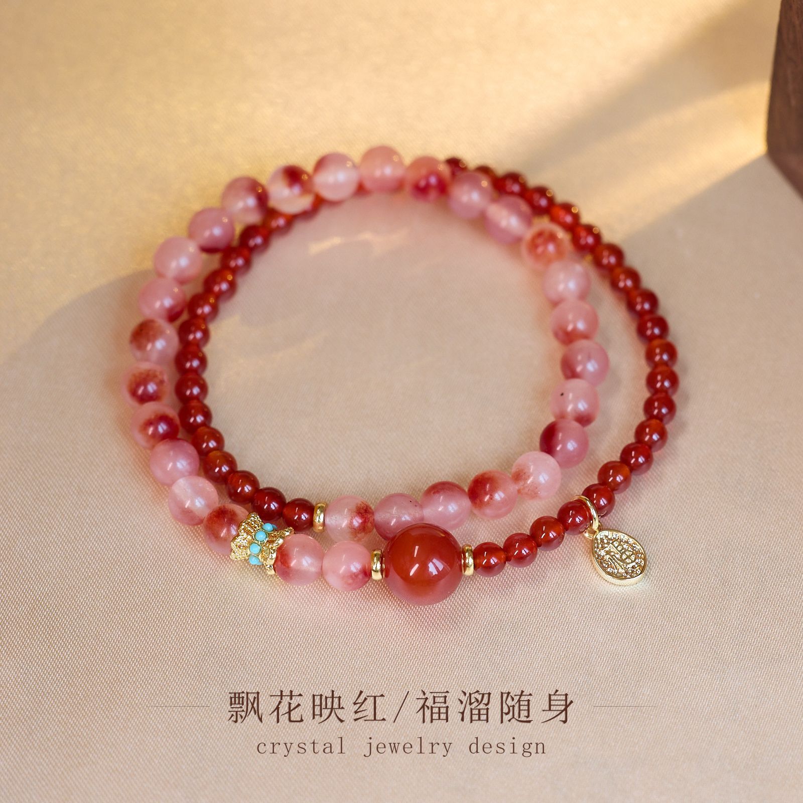4mm red agate floating flower agate fu character drip double ring bracelet