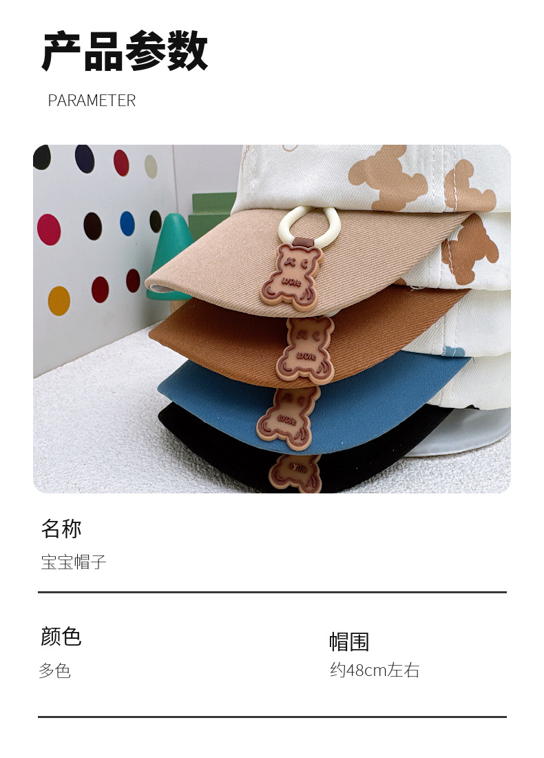 Type: Spring and Autumn Children's Baseball Cap Cap circumference: 46-48cm (measured by hand, with error) Weight per piece: 50g Color: Four-color Adjustable Hat Band with Magnetic Closure Age range: Suitable for both male and female babies aged 8-18 months (Please refer to the actual head circumference of the baby)