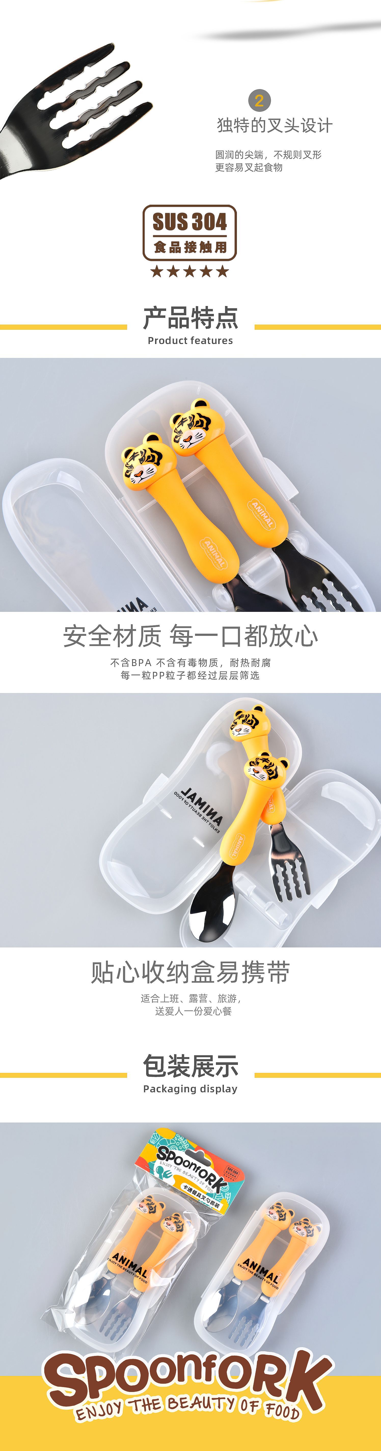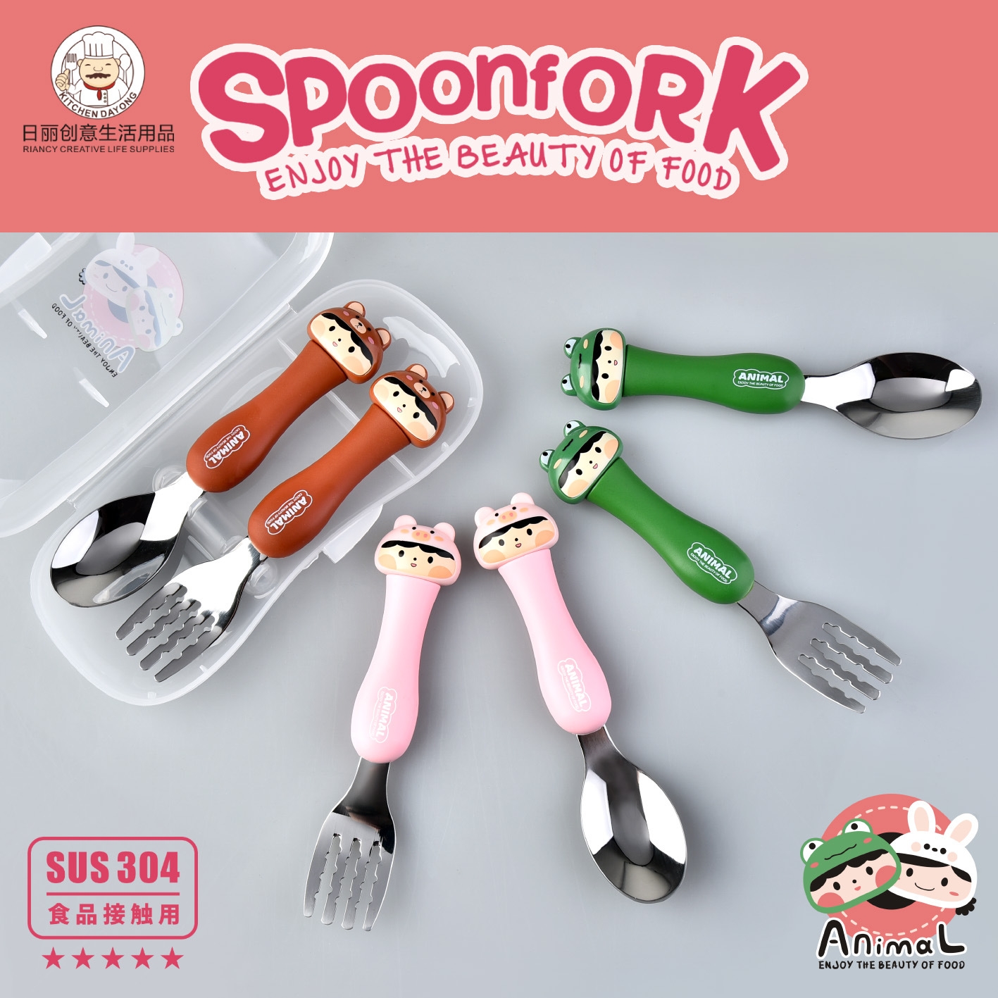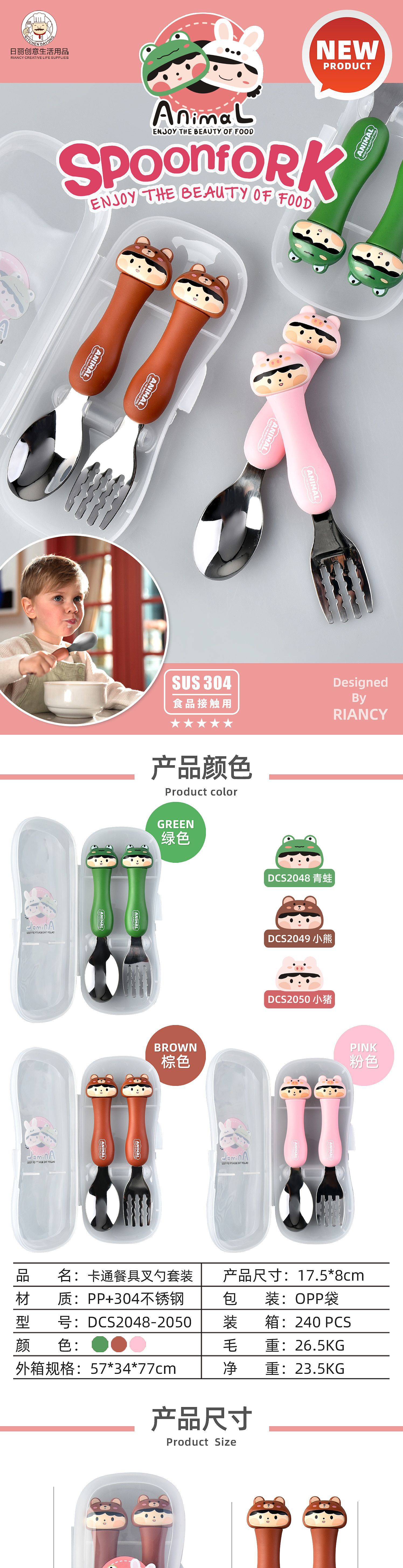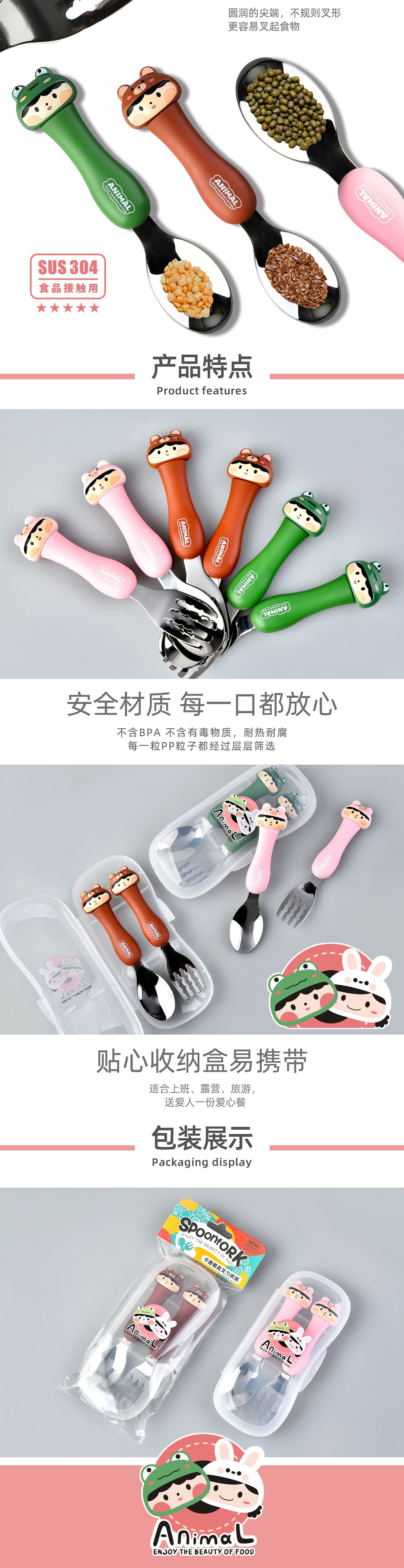 dcs2041-cartoon animal spork set (gray/yellow/pink/green/black/brown)