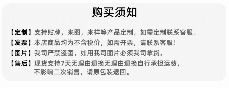 Small business operation, low profit margin, if the sold products have damage, please take photos and contact customer service for after-sales processing. Due to the large number of styles, there may be individual styles out of stock. If there is a stock shortage and we cannot contact the customer, we will send the available stock first, and if there is a stock shortage, we will contact the customer service for a refund. This store does not support any reason for quality problems, sales, etc. to return the goods. Please note that the 7-day reason only applies to individual self-used customers, and wholesale customers do not enjoy the 7-day reason. Thank you for your cooperation. The price of the small store does not include the opening of the bill. If you need to open the bill or custom, please contact the manager's WeChat.