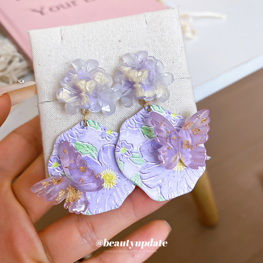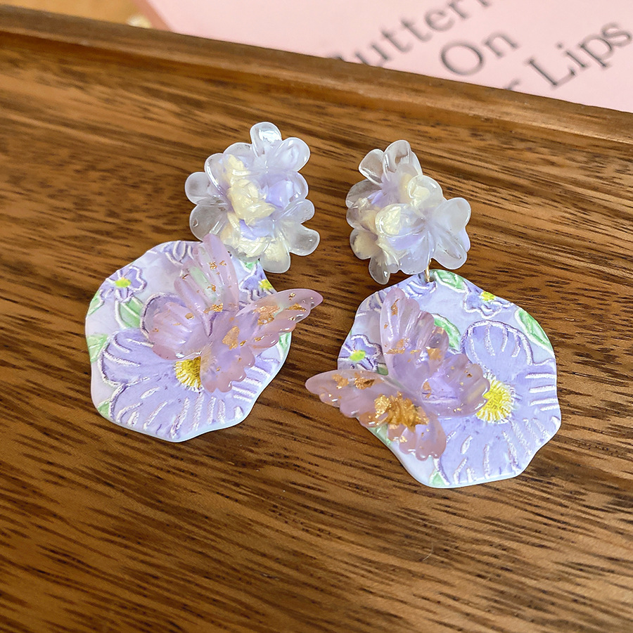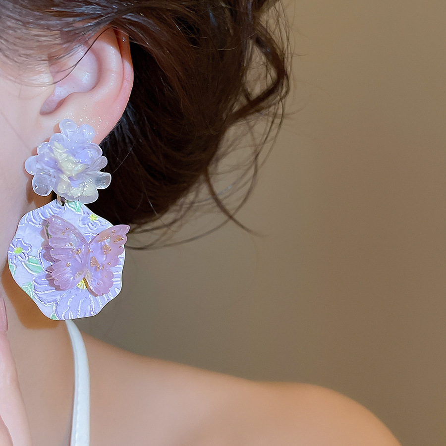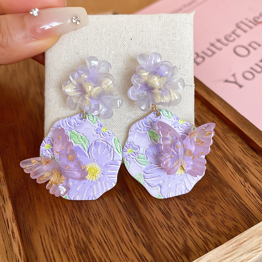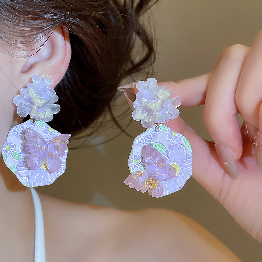 oil painting style ~ purple butterfly flower oil painting artistic earrings niche high sense earrings refined personalized earrings