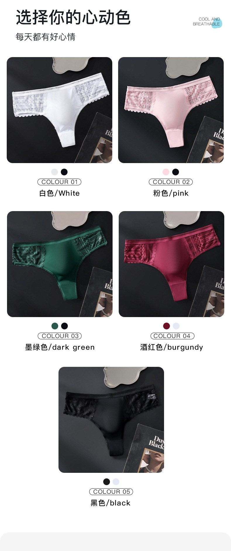 color: white, pink, dark green, wine red, black