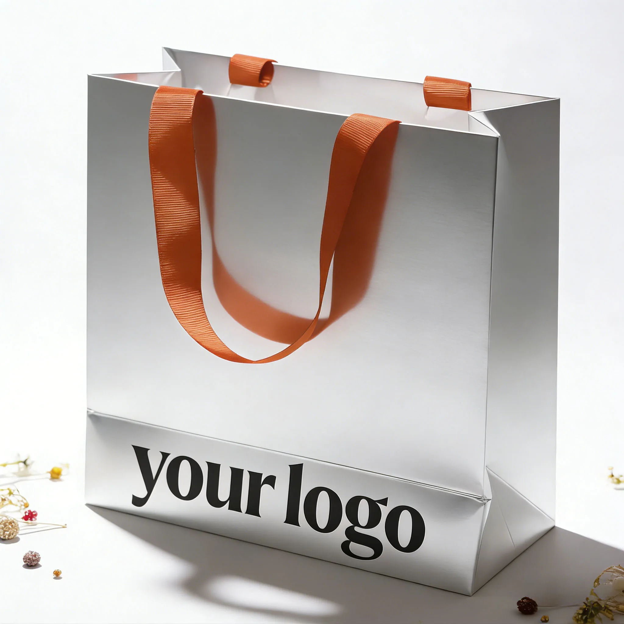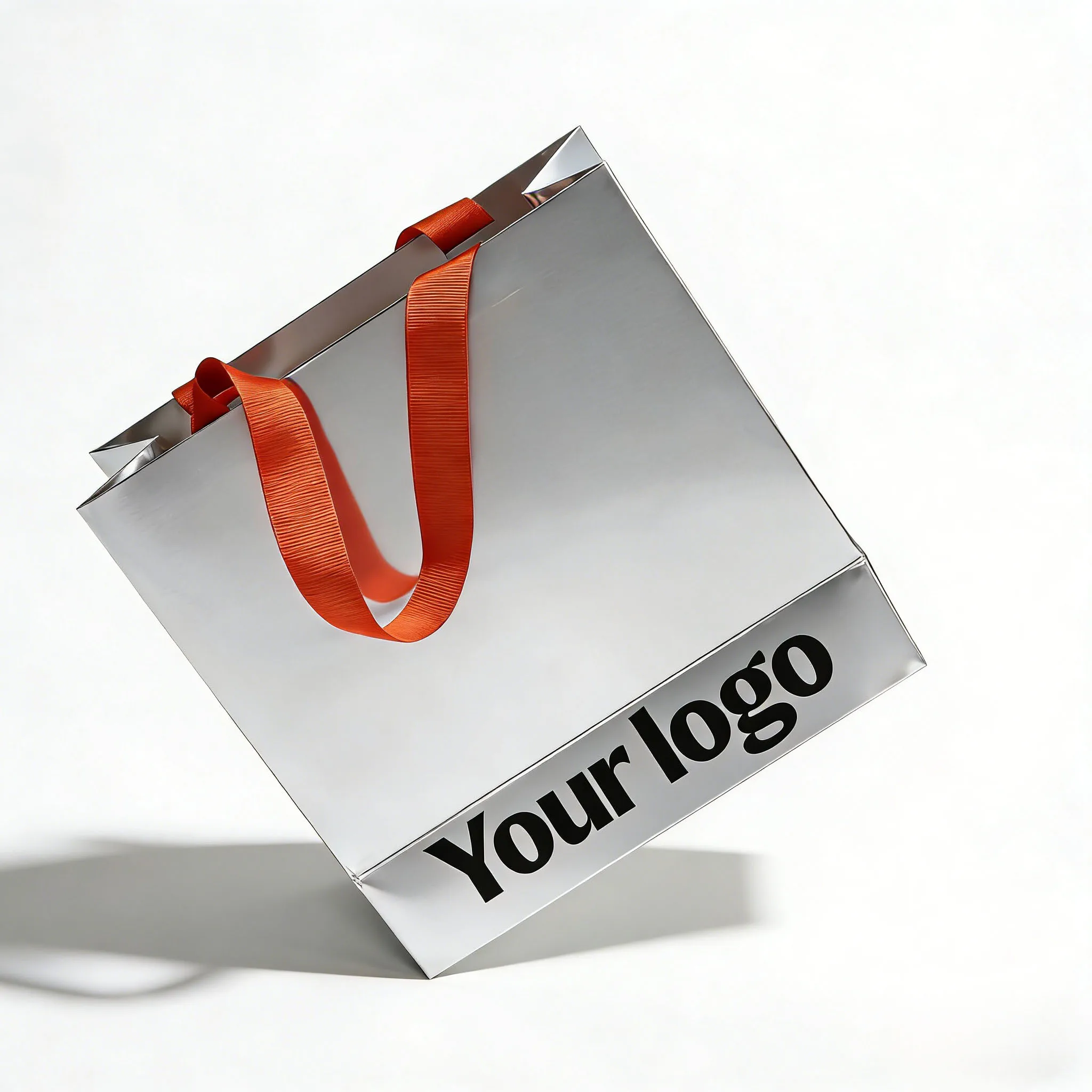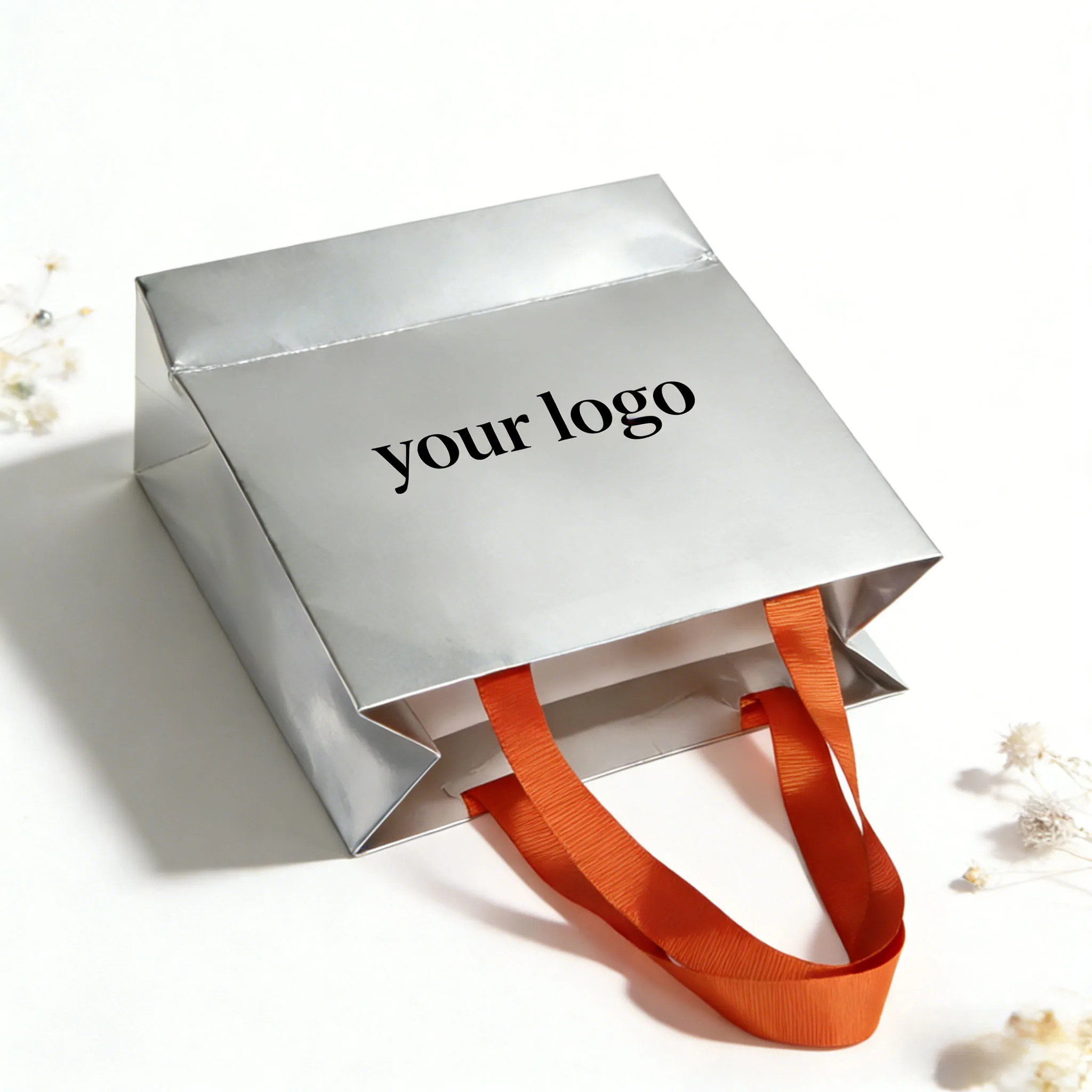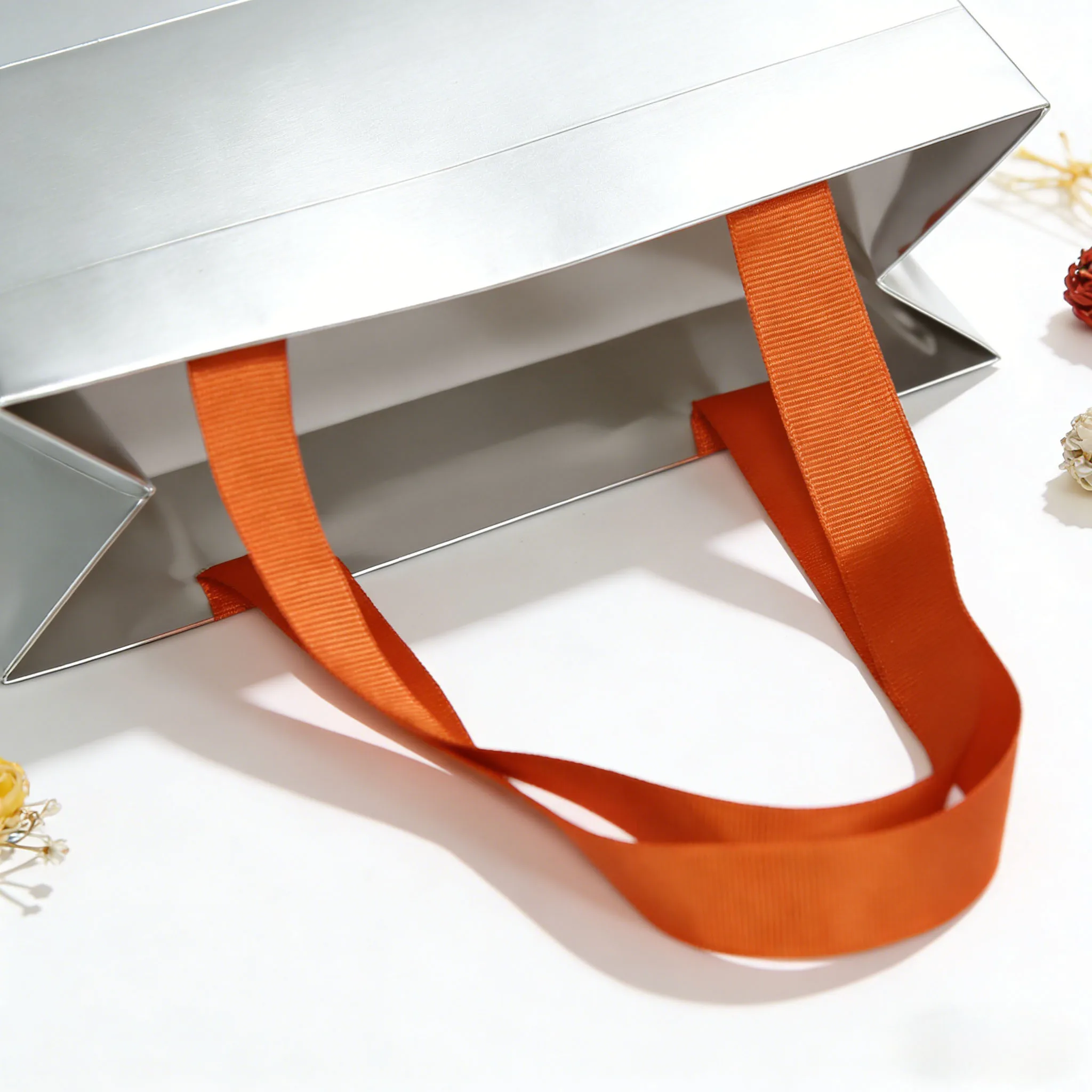 silver high-end gift handbag custom logo jewelry shop special orange ribbon portable paper bag