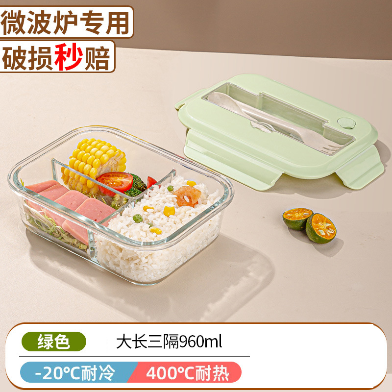 large long bento box with cutlery, three compartments, matcha green