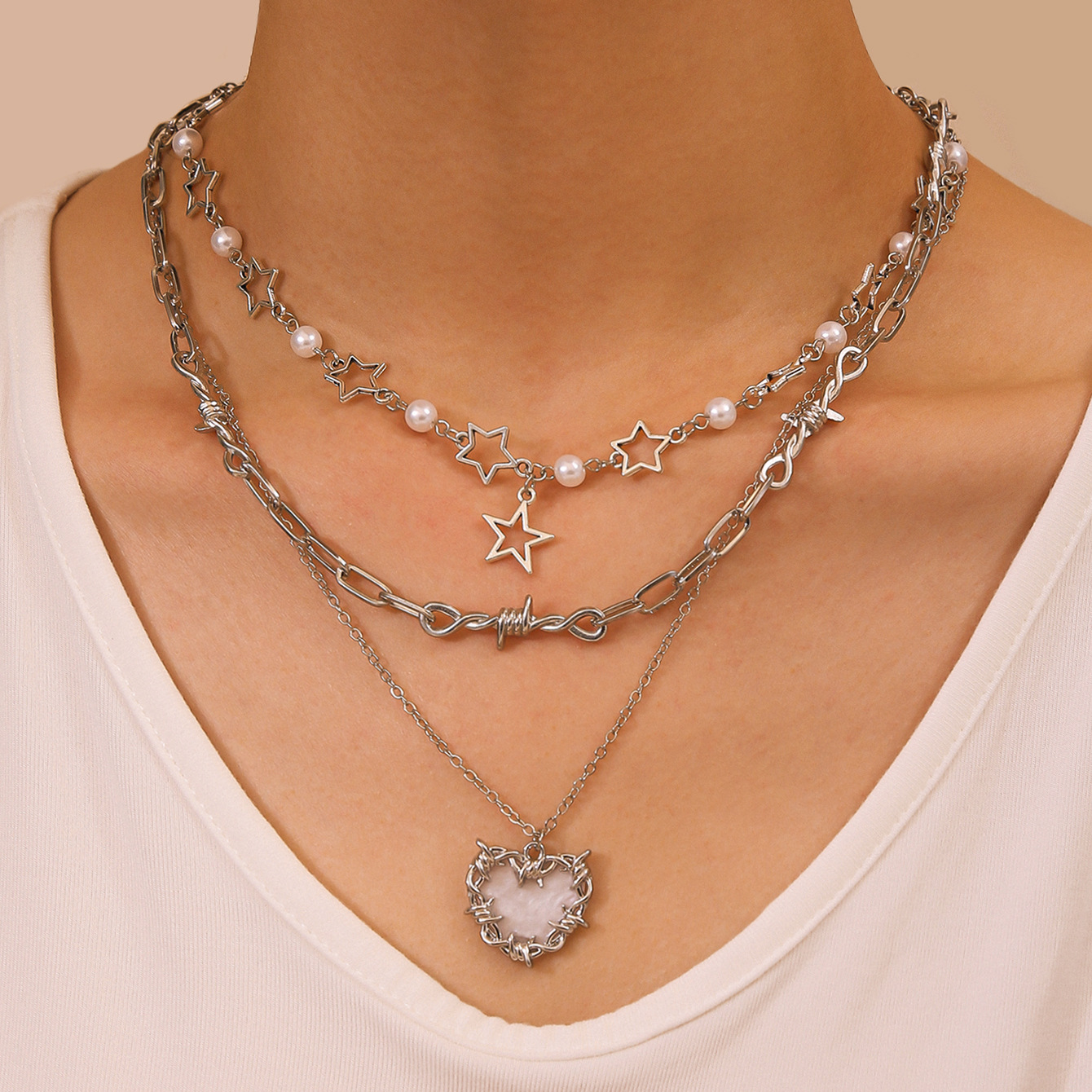 三件五角星爱心项链-银色