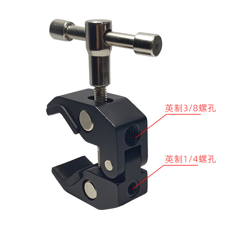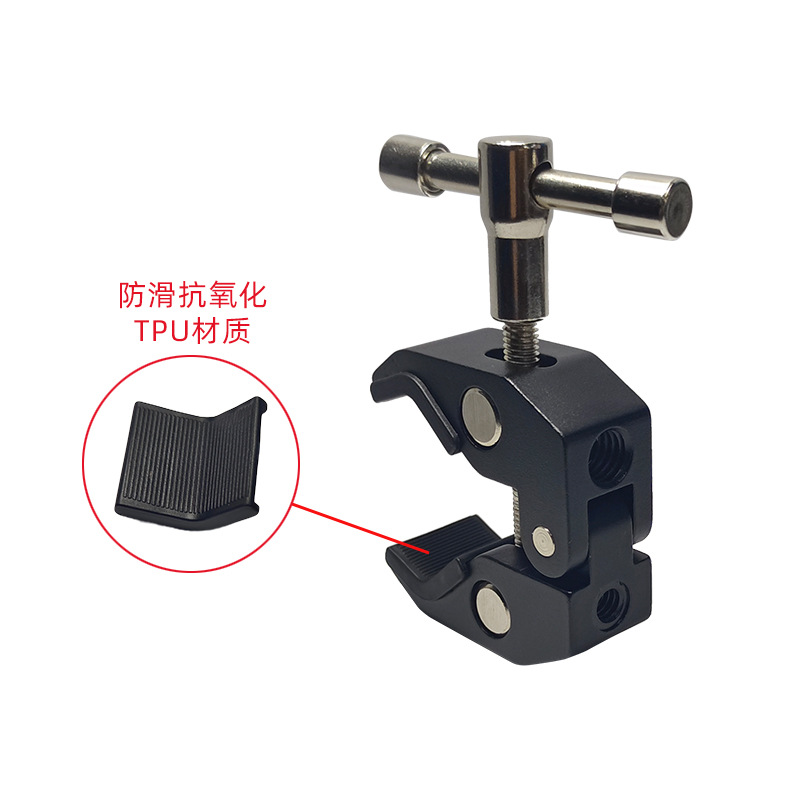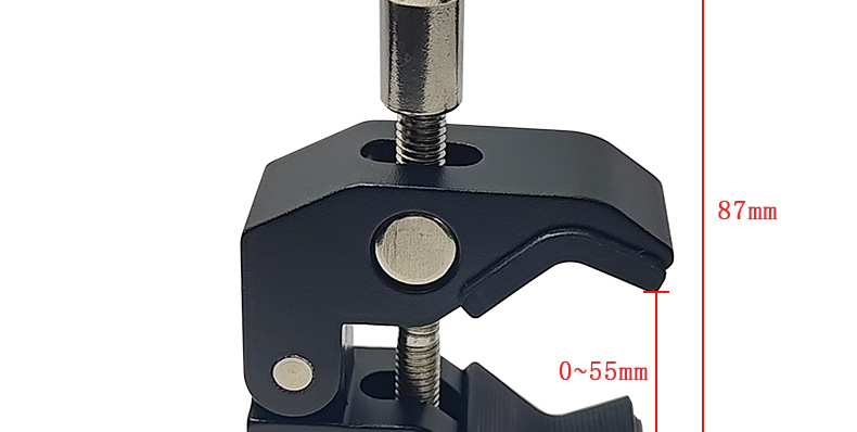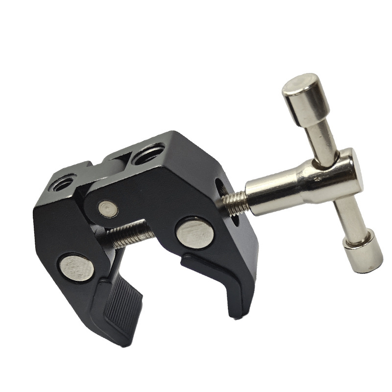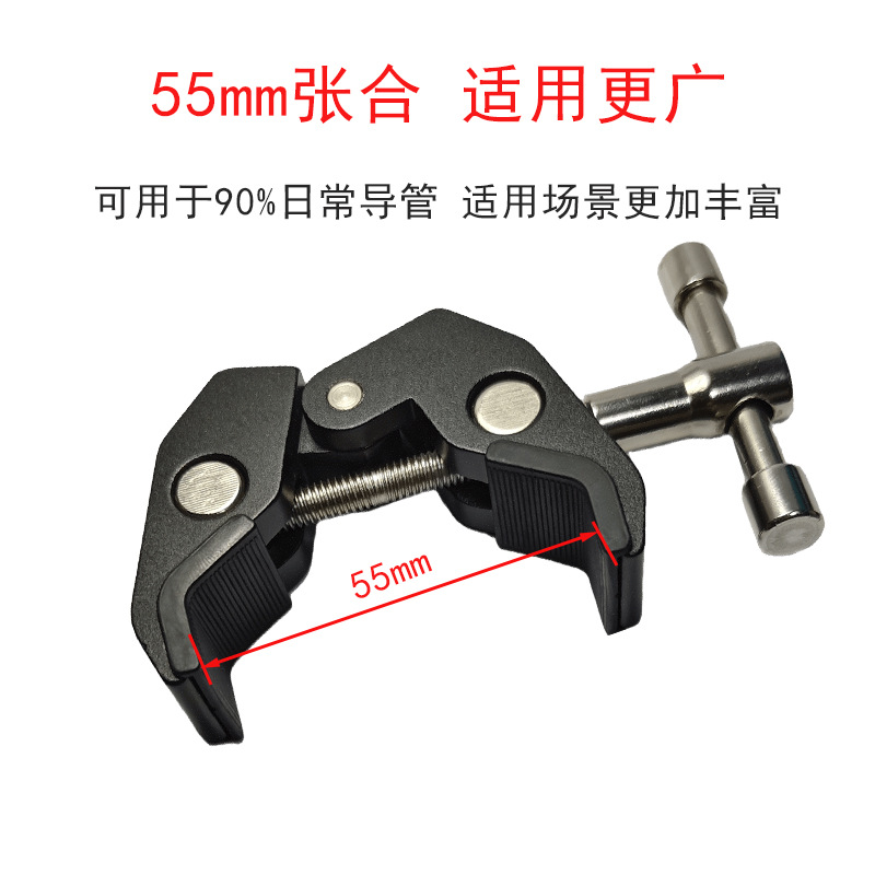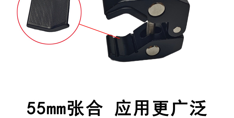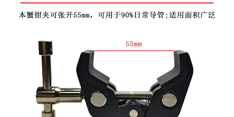 This crab clamp is made of aluminum alloy, with a maximum opening size of 55mm and a minimum closing size of 10mm. It has two expansion holes for 1/4 and 3/8-inch screws. Direct factory sales with immediate stock availability!