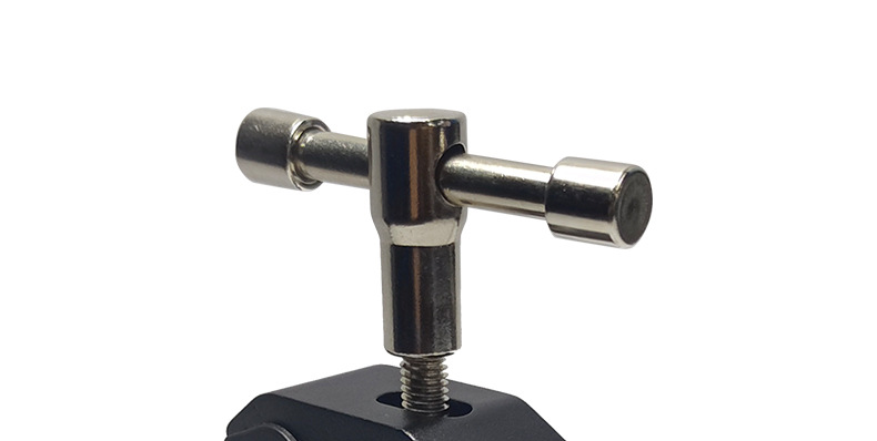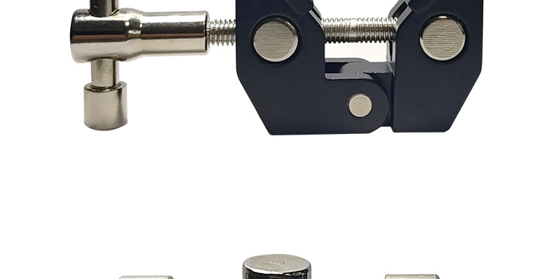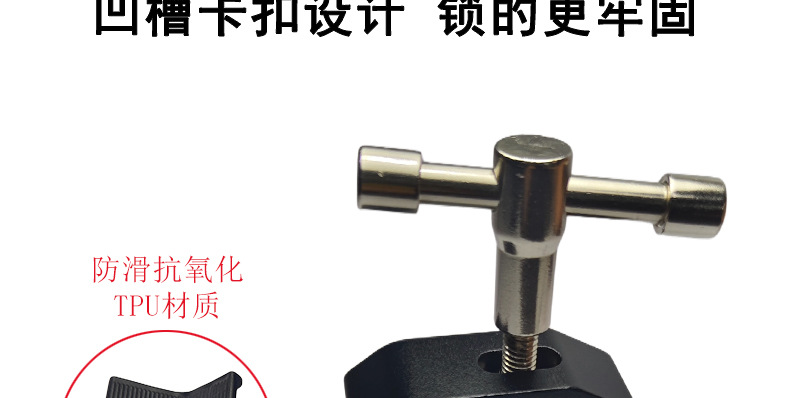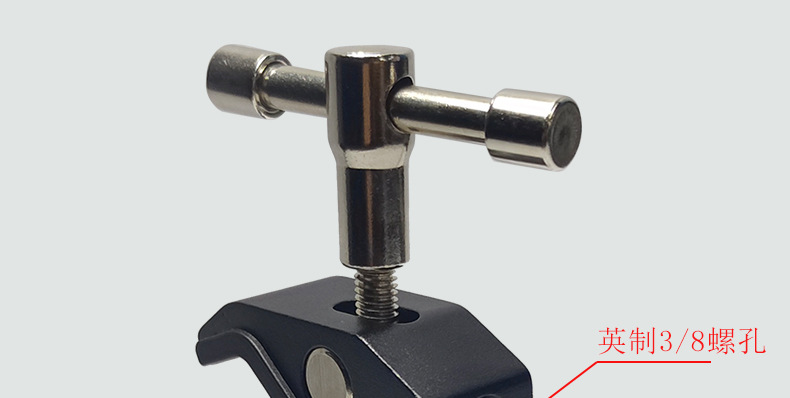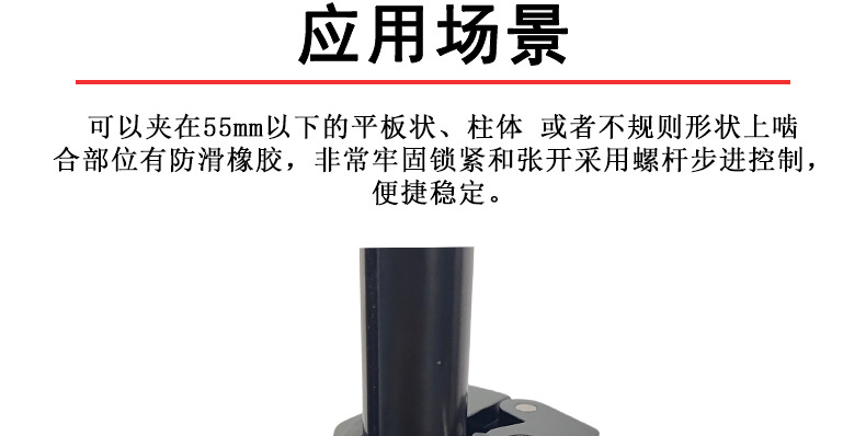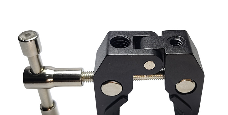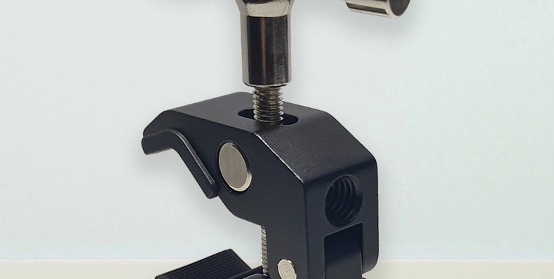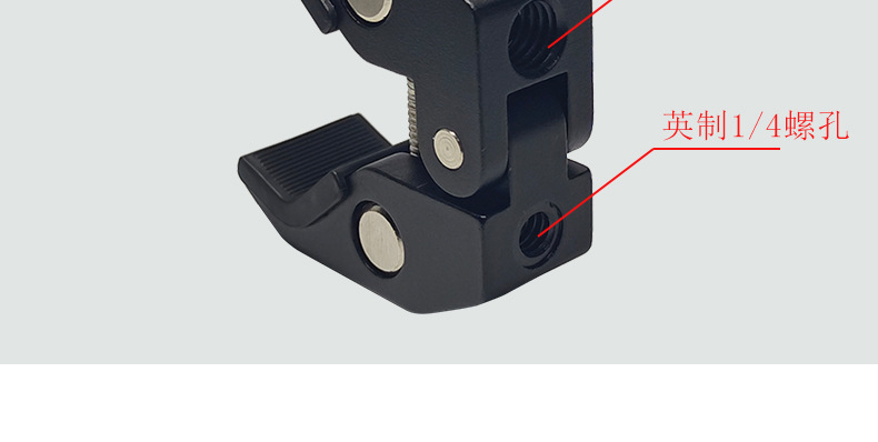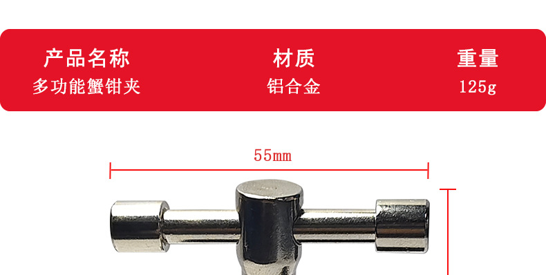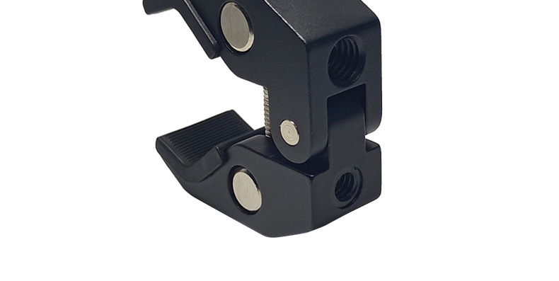This crab clamp is made of aluminum alloy, with a maximum opening size of 55mm and a minimum closing size of 10mm. It has two expansion holes for 1/4 and 3/8-inch screws. Direct factory sales with immediate stock availability!