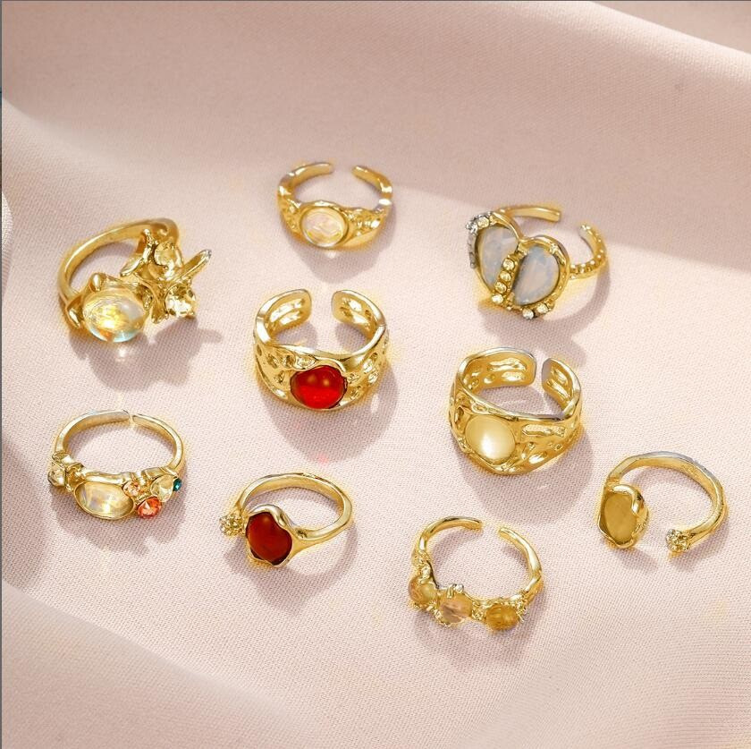 猫眼石花蕾分裂戒指 9件套 金色5832602