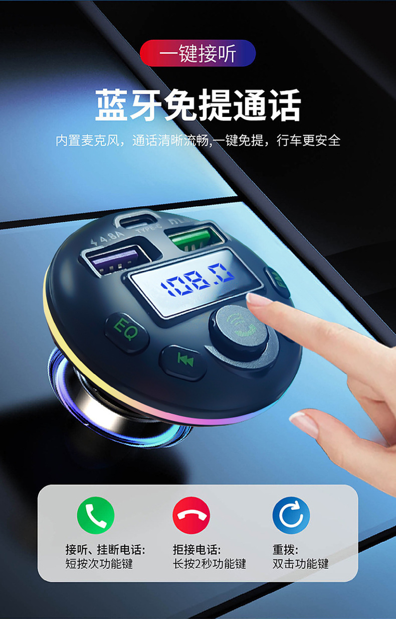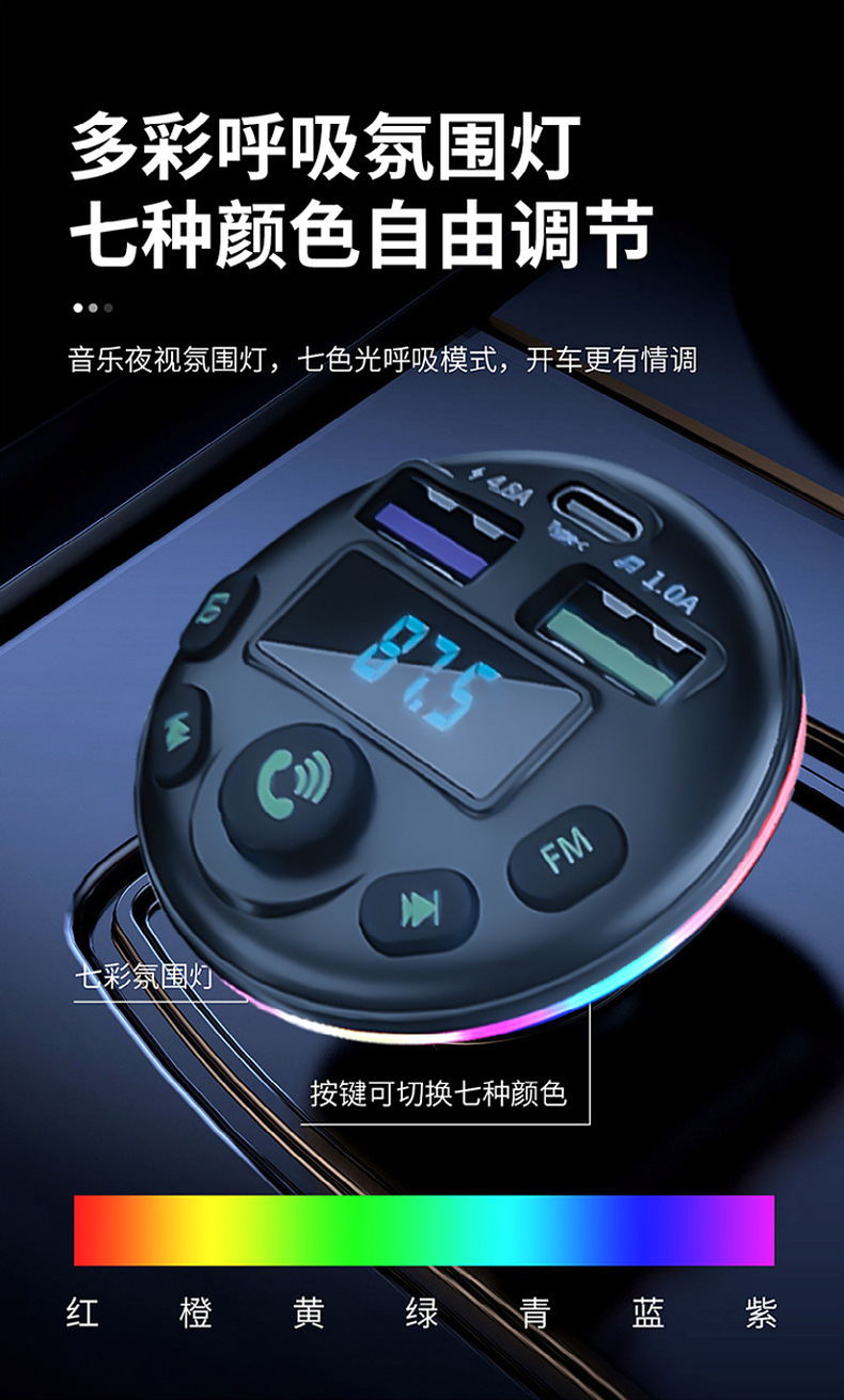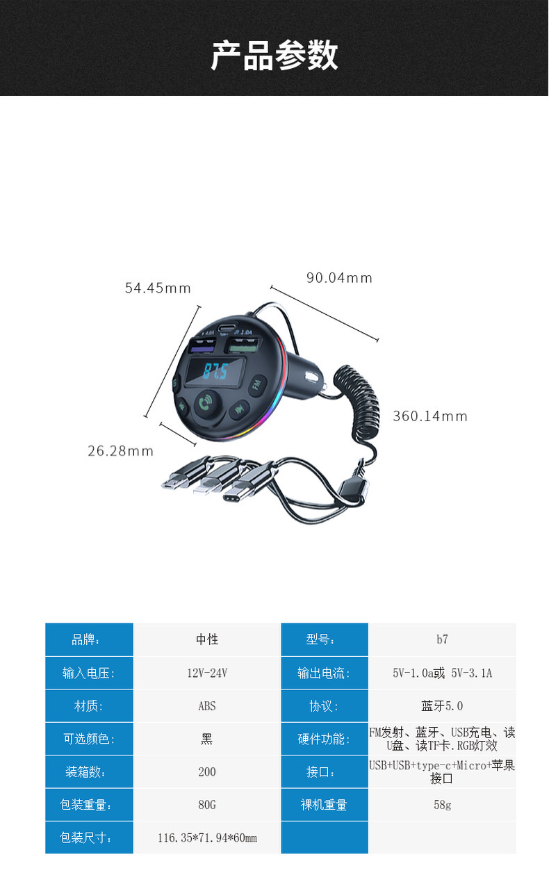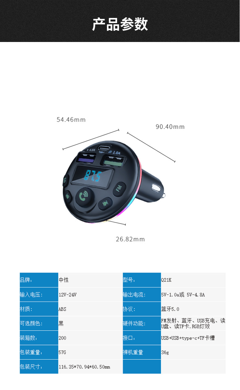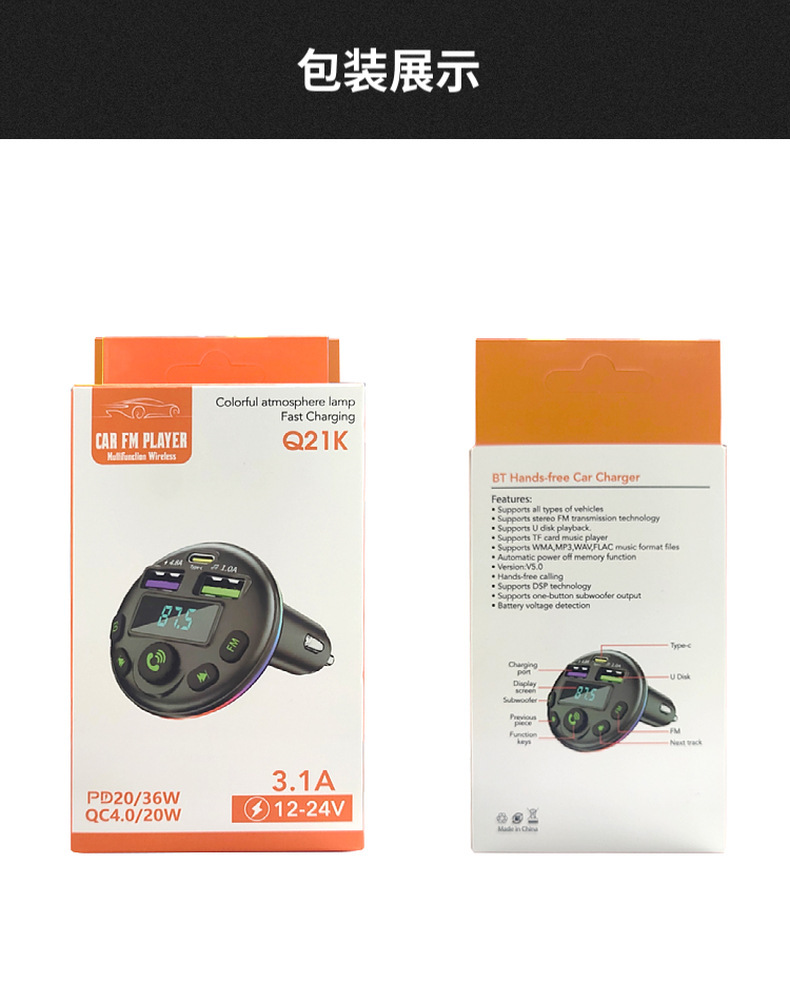 1. Shell Material: ABS 2. Shell material surface process: fine lines, high shine 3. Features: Appearance Patent, Display Current, Voltage 4. Input: 12-24 5. Output: 5V-1.5A or 5V-3.1A; 6. Total Power: 7.5-20W 7. Output Type: USB, type-c 8. Protocol: Bluetooth 5.3 9: Hardware Features: FM Transmitter, Bluetooth, USB Charging, U Disk Reading, Colorful Lights, EQ Function
