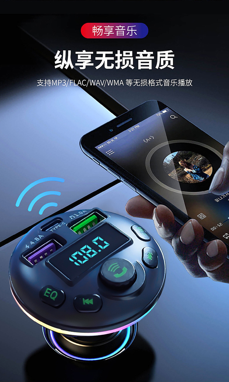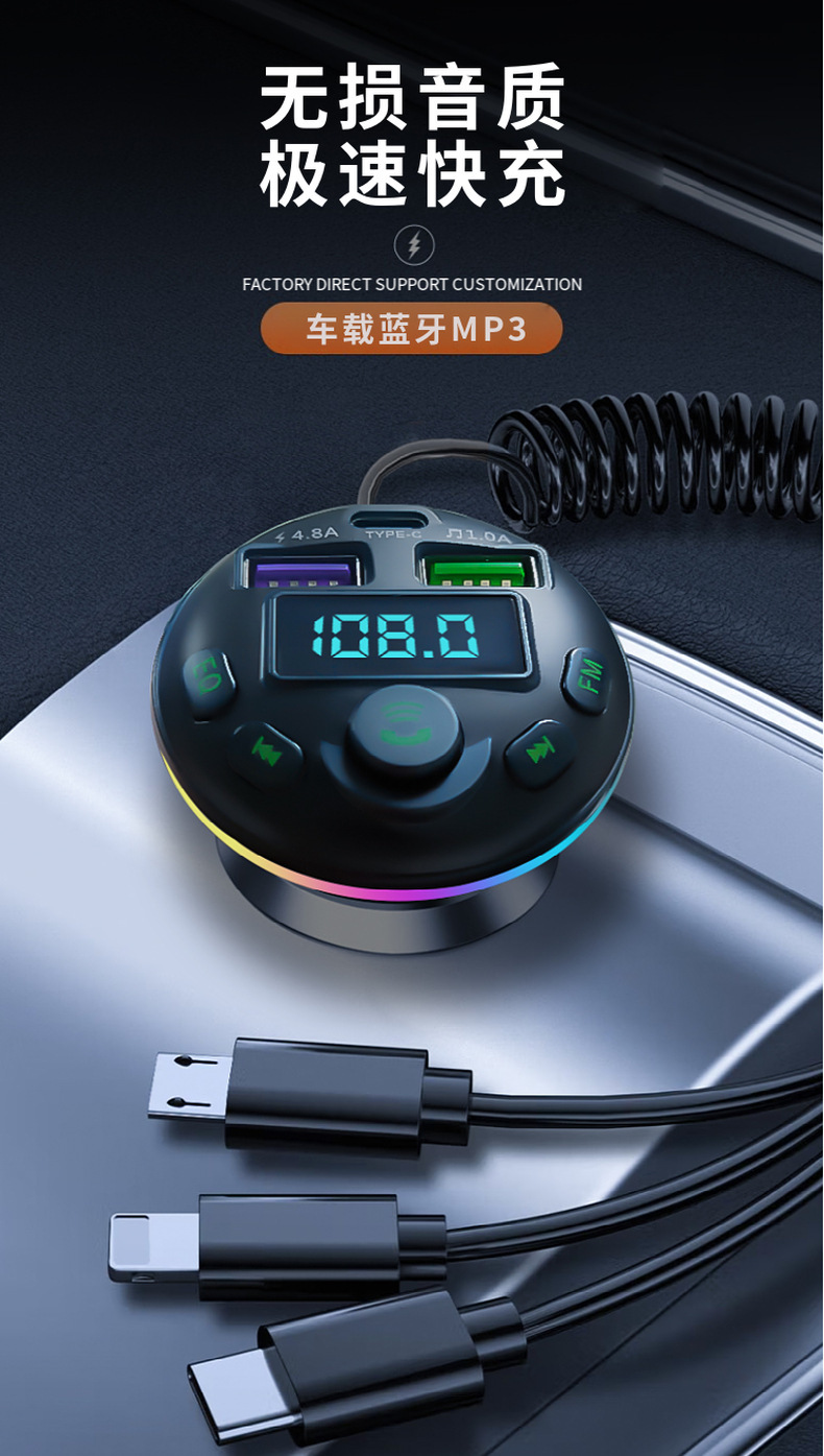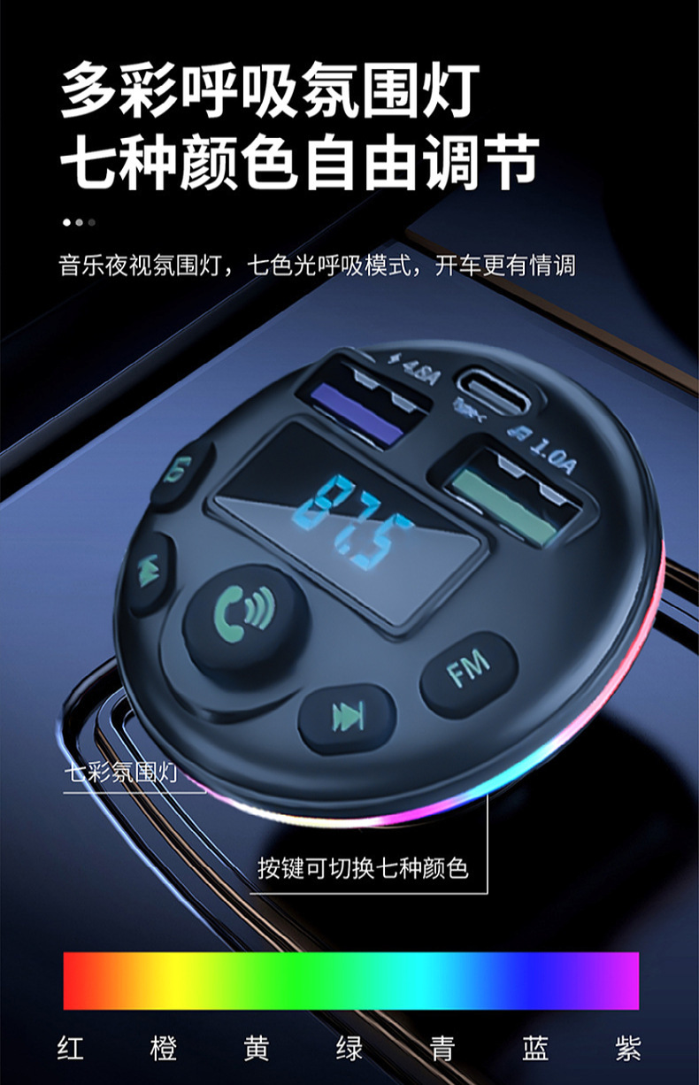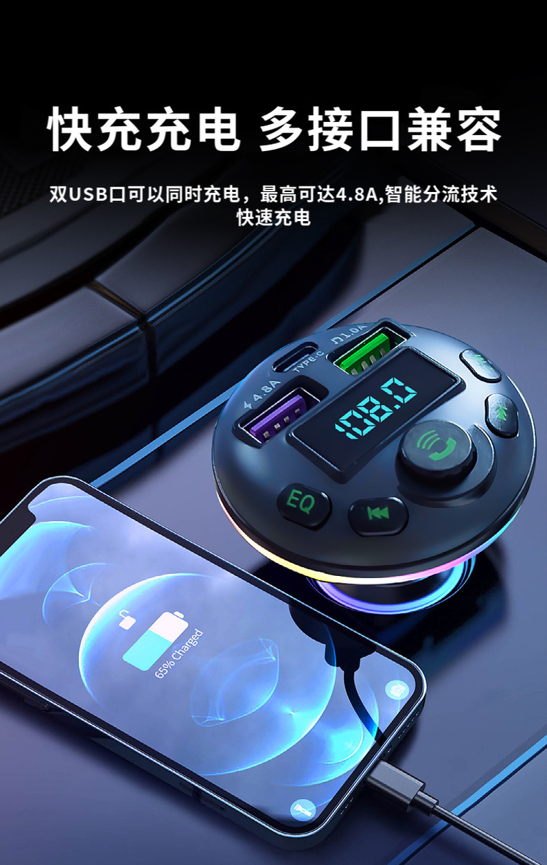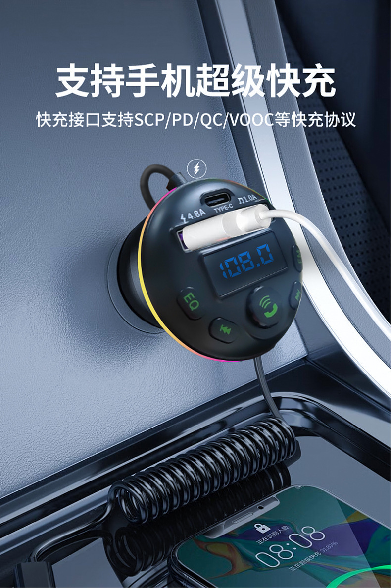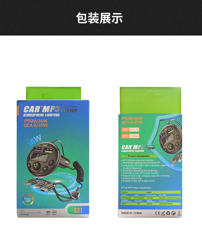 1. Shell Material: ABS 2. Shell material surface process: fine lines, high shine 3. Features: Appearance Patent, Display Current, Voltage 4. Input: 12-24 5. Output: 5V-1.5A or 5V-3.1A; 6. Total Power: 7.5-20W 7. Output Type: USB, type-c 8. Protocol: Bluetooth 5.3 9: Hardware Features: FM Transmitter, Bluetooth, USB Charging, U Disk Reading, Colorful Lights, EQ Function