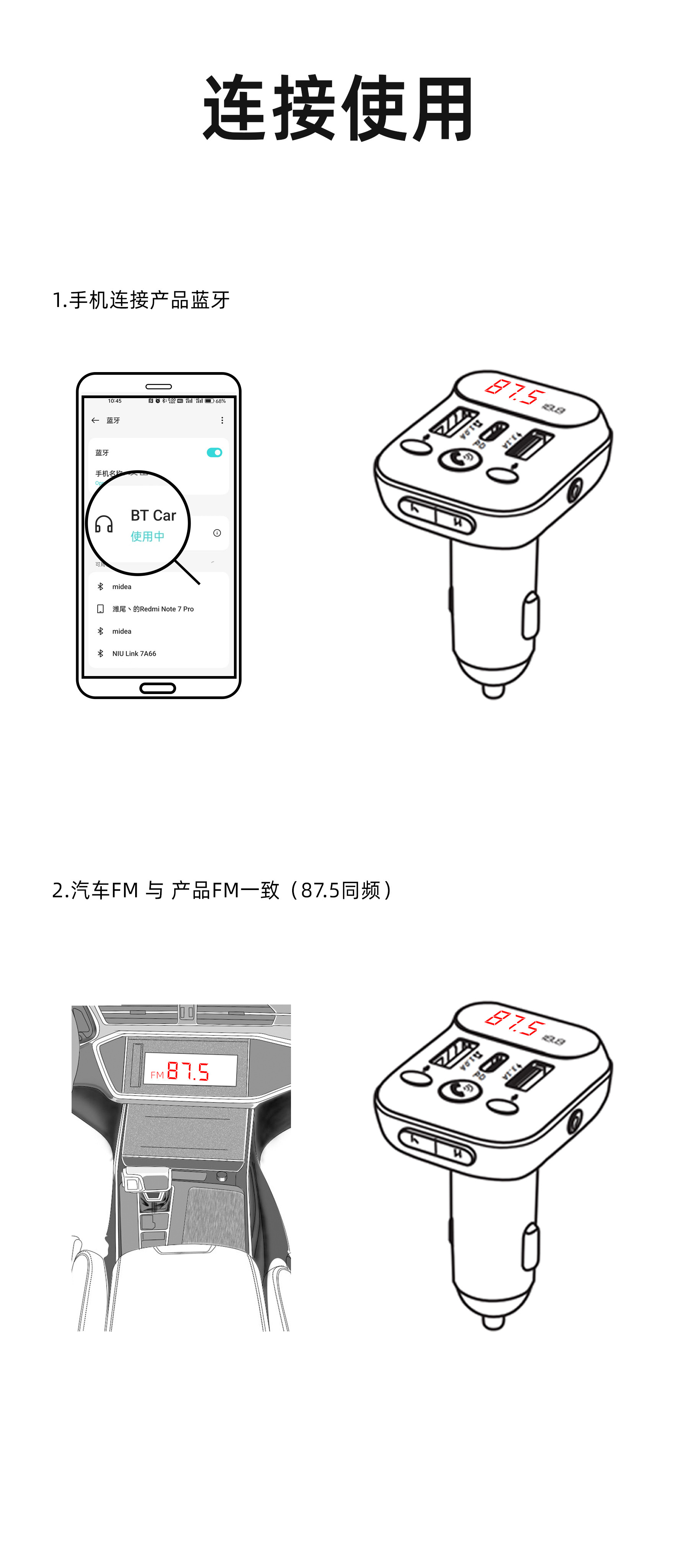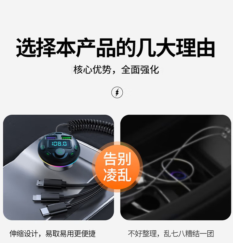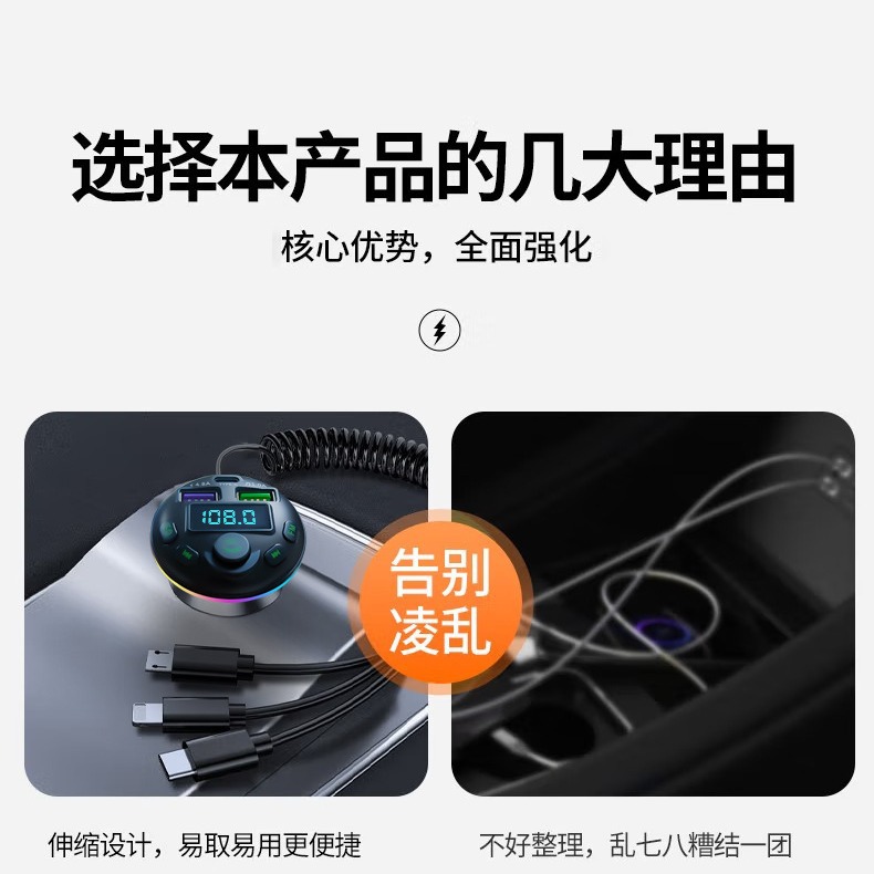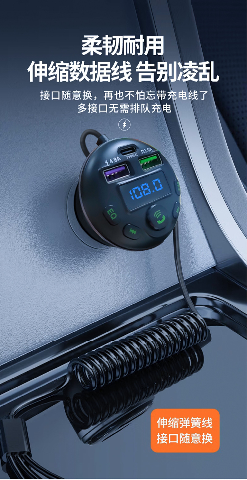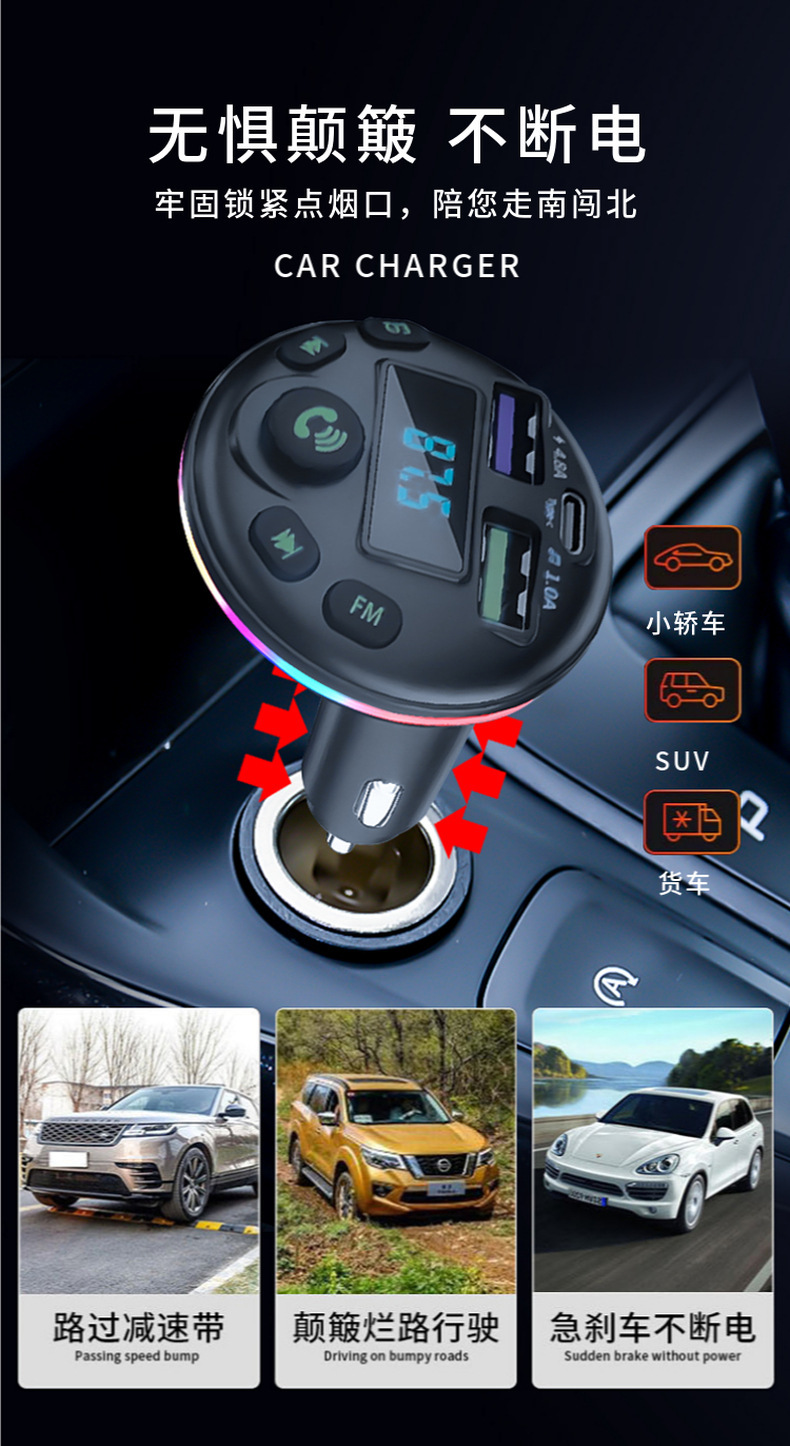 1. Shell Material: ABS 2. Shell material surface process: fine lines, high shine 3. Features: Appearance Patent, Display Current, Voltage 4. Input: 12-24 5. Output: 5V-1.5A or 5V-3.1A; 6. Total Power: 7.5-20W 7. Output Type: USB, type-c 8. Protocol: Bluetooth 5.3 9: Hardware Features: FM Transmitter, Bluetooth, USB Charging, U Disk Reading, Colorful Lights, EQ Function