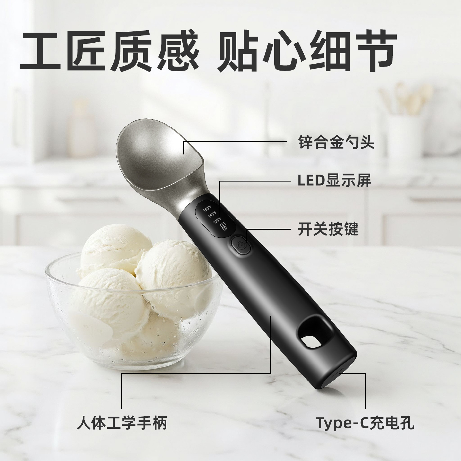 Product material: zinc alloy + food-grade ABS; Power supply: rechargeable.