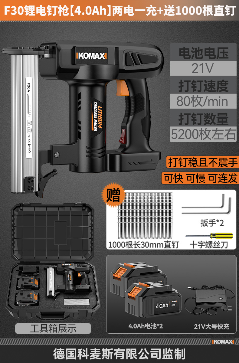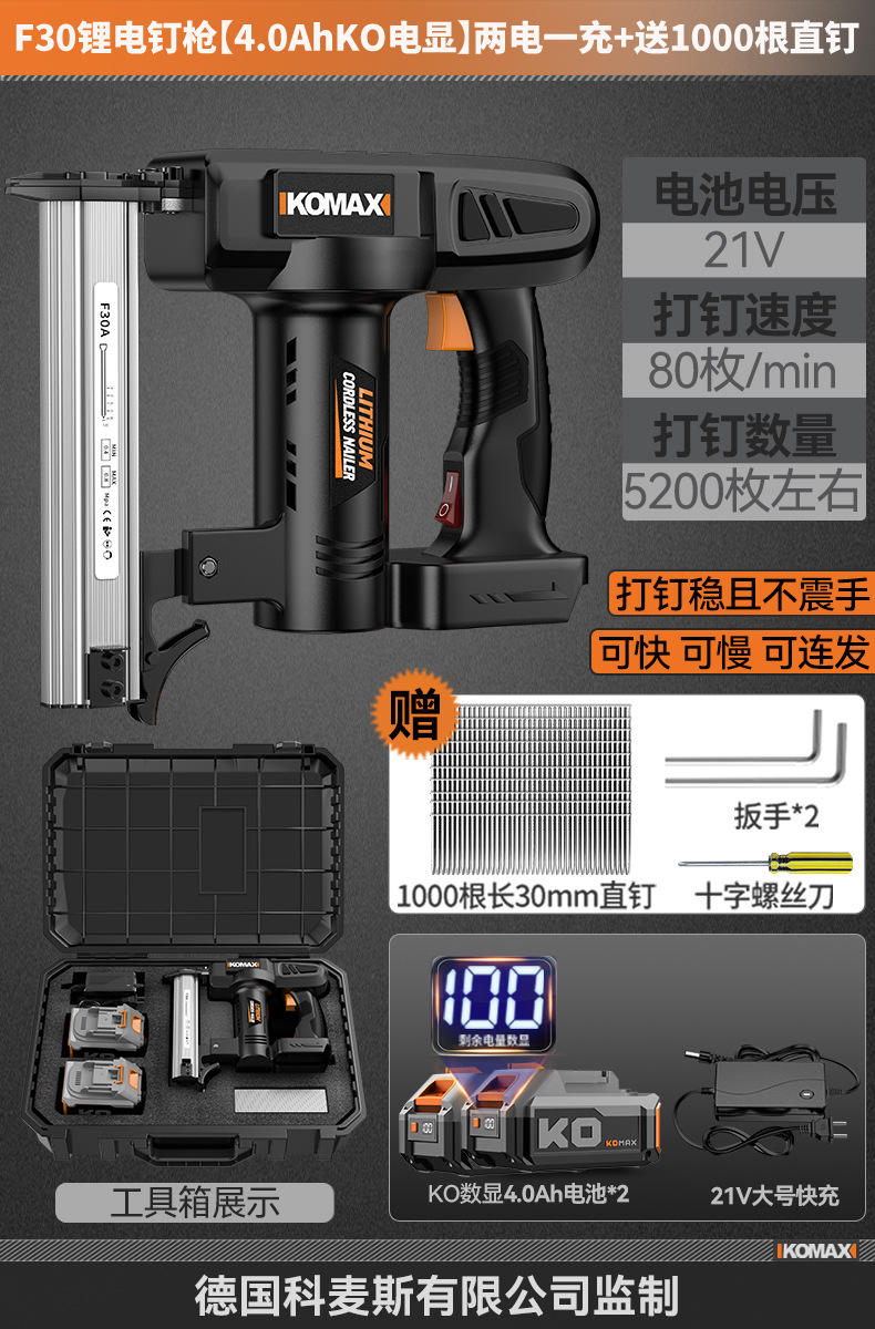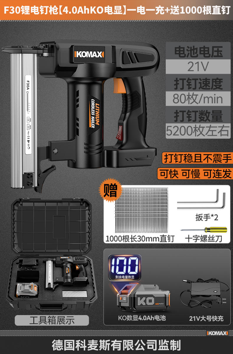 F30锂电钉枪【KO数显4.0Ah】两电一充+送1000根直钉