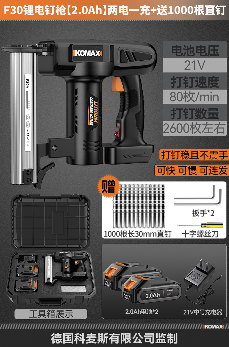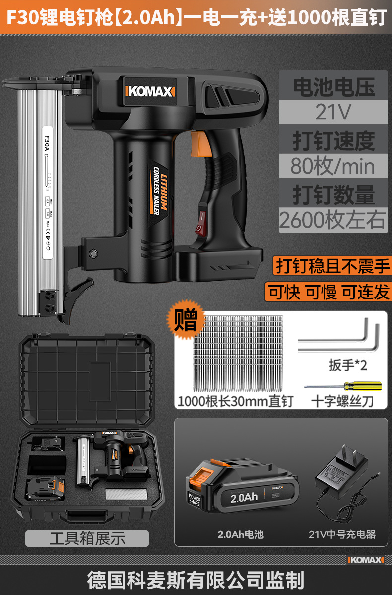 F30锂电钉枪【2.0Ah】一电一充+送1000根直钉