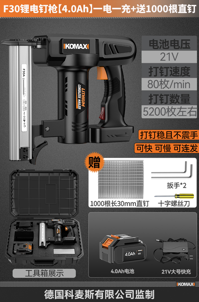 F30锂电钉枪【KO数显4.0Ah】一电一充+送1000根直钉