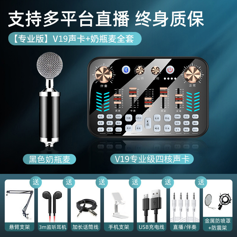 【旗舰款】V19声卡+奶瓶麦+声卡配件全套★免调试