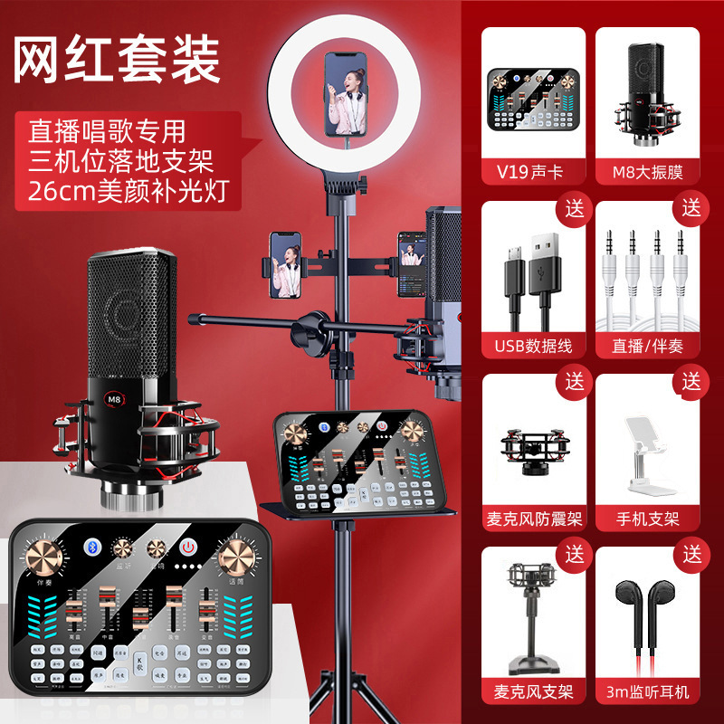 【专业款】V19声卡+M8大振膜麦+声卡配件全套+落地补光灯