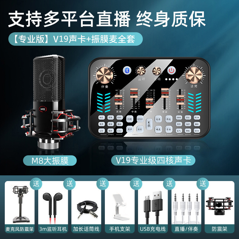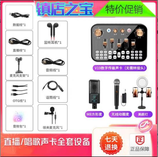 【旗舰款】V19声卡+M8大振膜麦+声卡配件全套★免调试